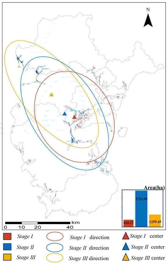 The spatial–temporal variation in mangrove area in Zhanjiang (ellipses and rectangles in different colors indicate the different stages of mangrove direction and center change).