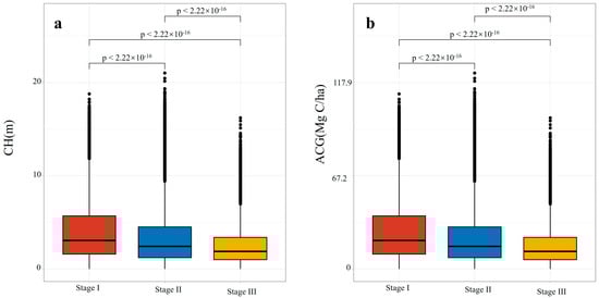 Based on the classification of mangrove age stages, significant differences were observed among the three stages (Figure 7). Canopy height (CH) showed a clear negative relationship with forest age, with Stage I exhibiting the highest CH, followed by Stage II and Stage III. Because aboveground carbon stock (ACG) was derived from CH, its temporal pattern across age stages was consistent with that of CH.