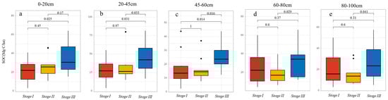 The temporal dynamics of soil carbon stocks were found to be significant within the 0–60 cm soil layer []. In this study, we first calculated SOC for eight individual depth intervals and then aggregated them into five standardized layers (0–20, 20–40, 40–60, 60–80, and 80–100 cm) to analyze temporal variations. The raw data are presented in Table A1 and Table A2.