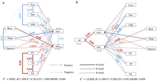 Structural equation modeling (SEM) was used to quantify the direct and indirect effects of eight primary drivers (TN, TP, SA, Stage, Root, VPD, Temp, and Pre) on SOC and ACG. In the SEM framework, Root and Stage represented species functional type and stand age, respectively. Models were implemented using the psem function in the ‘piecewiseSEM’ package (R version 4.3.3 (R Core Team, Vienna, Austria), with generalized least squares (GLS) employed to account for spatial autocorrelation among age stages and to improve model robustness [,]. The best-fitting model was identified as the one with the lowest AIC and a statistically significant chi-square test (p < 0.05) [,].