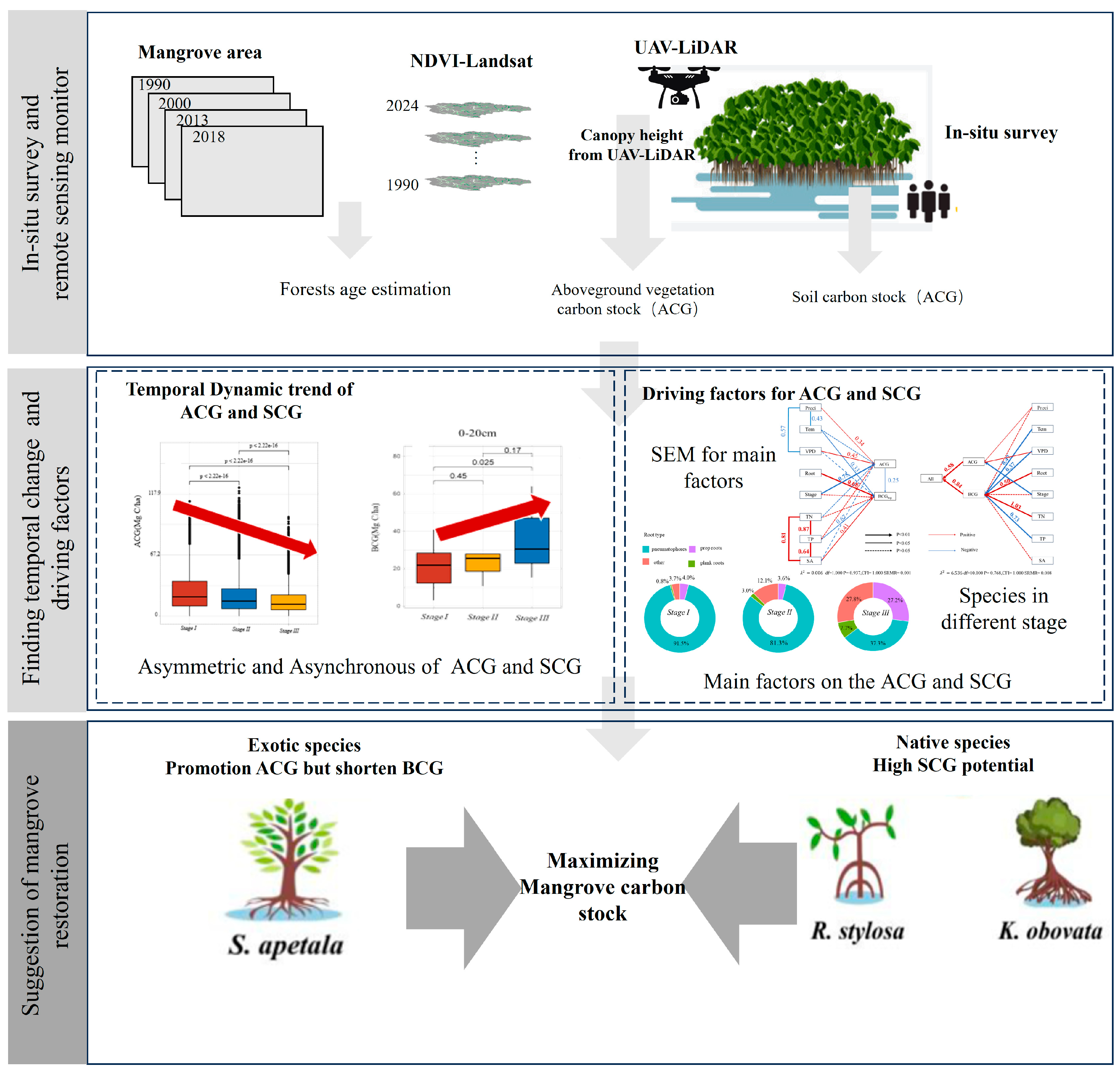 Chicago/Turabian StyleWang, Zongyang, Fen Guo, Xuelan Zeng, Zixun Huang, Honghao Xie, Xiaoguang Ouyang, and Yuan Zhang. 2025. "Trade-Offs in Aboveground and Soil Mangrove Carbon Stocks Under Species Introduction: Remote Sensing Reveals Temporal Divergence in Restoration Trajectories" Forests 16, no. 11: 1696. https://doi.org/10.3390/f16111696
