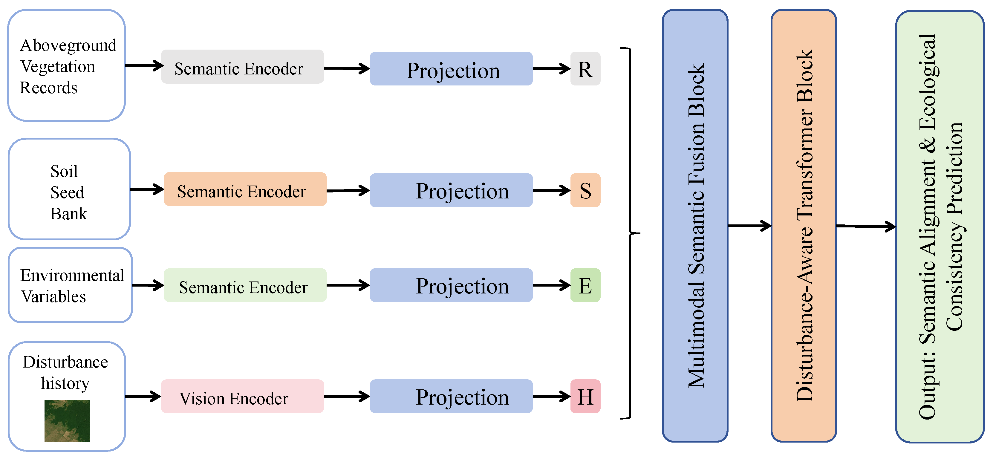 - Multi-channel ecological semantic encoder: A Transformer-based encoder integrates heterogeneous ecological features—species composition, functional traits, and environmental variables—into interpretable multi-scale embeddings, enabling cross-modal semantic fusion.