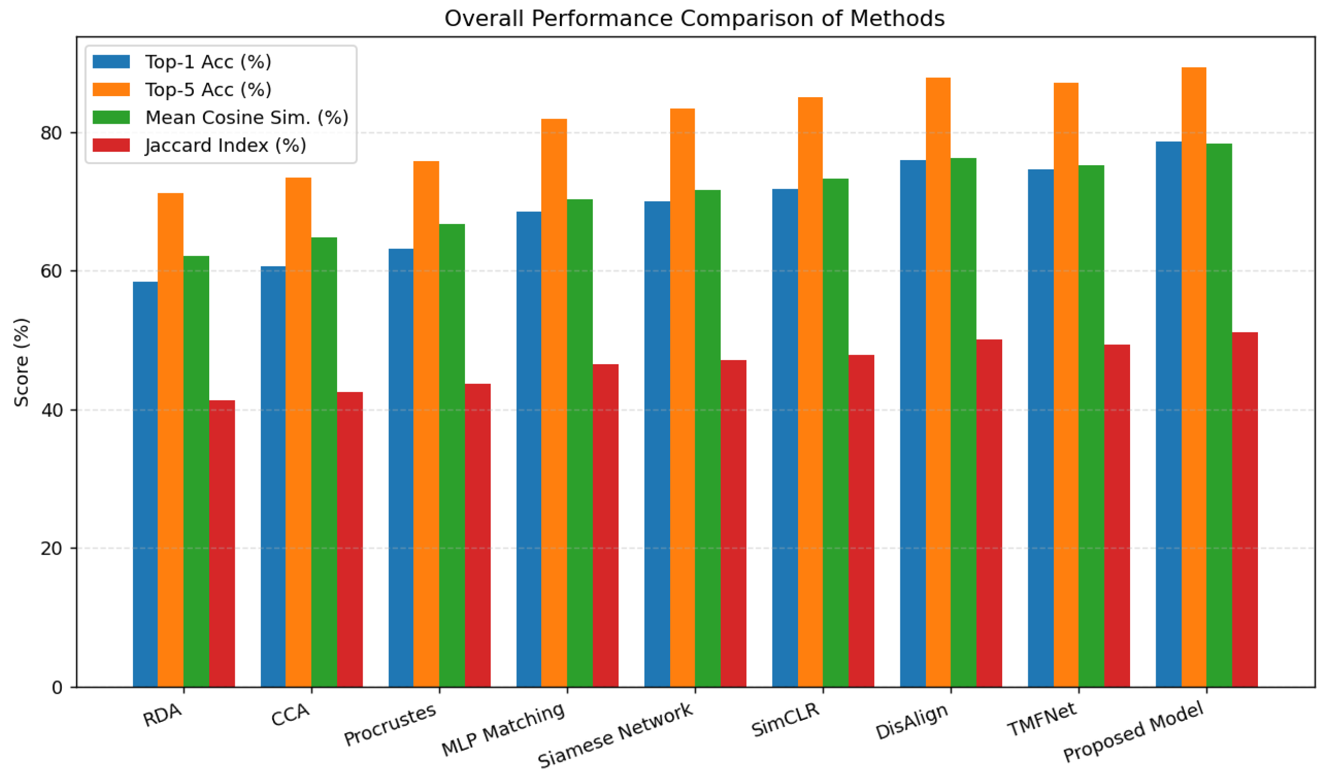 | Method | Top-1 Acc (%) | Top-5 Acc (%) | Mean Cosine Sim. | Jaccard Index |