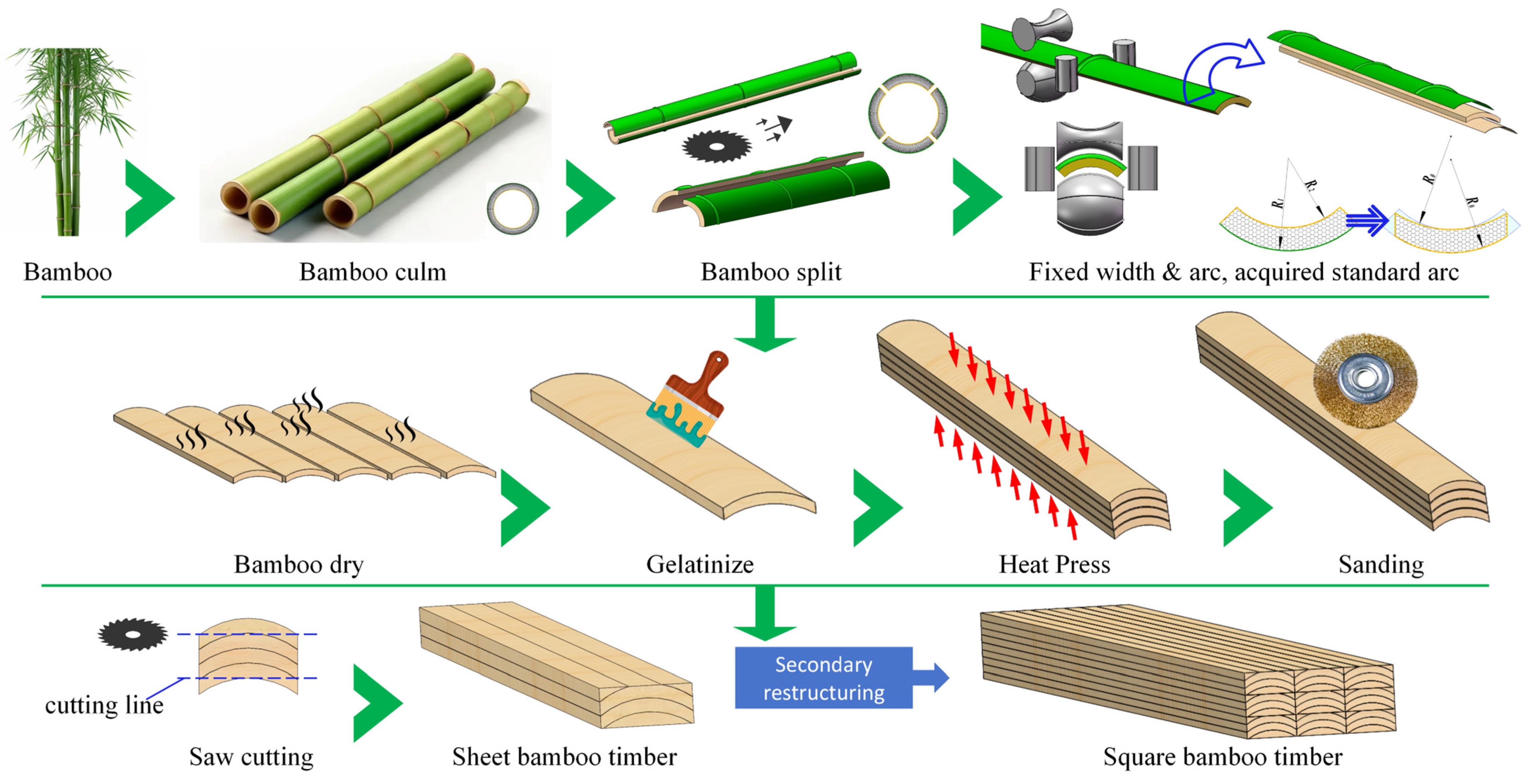Wang, G.; Gao, R.; Miao, H.; Wang, Y.; Fang, C.; Liu, H. Manufacturing Process and Performance Experiment of Natural Arc-Shaped Bamboo Laminated Lumber. Forests 2025, 16, 1699. https://doi.org/10.3390/f16111699