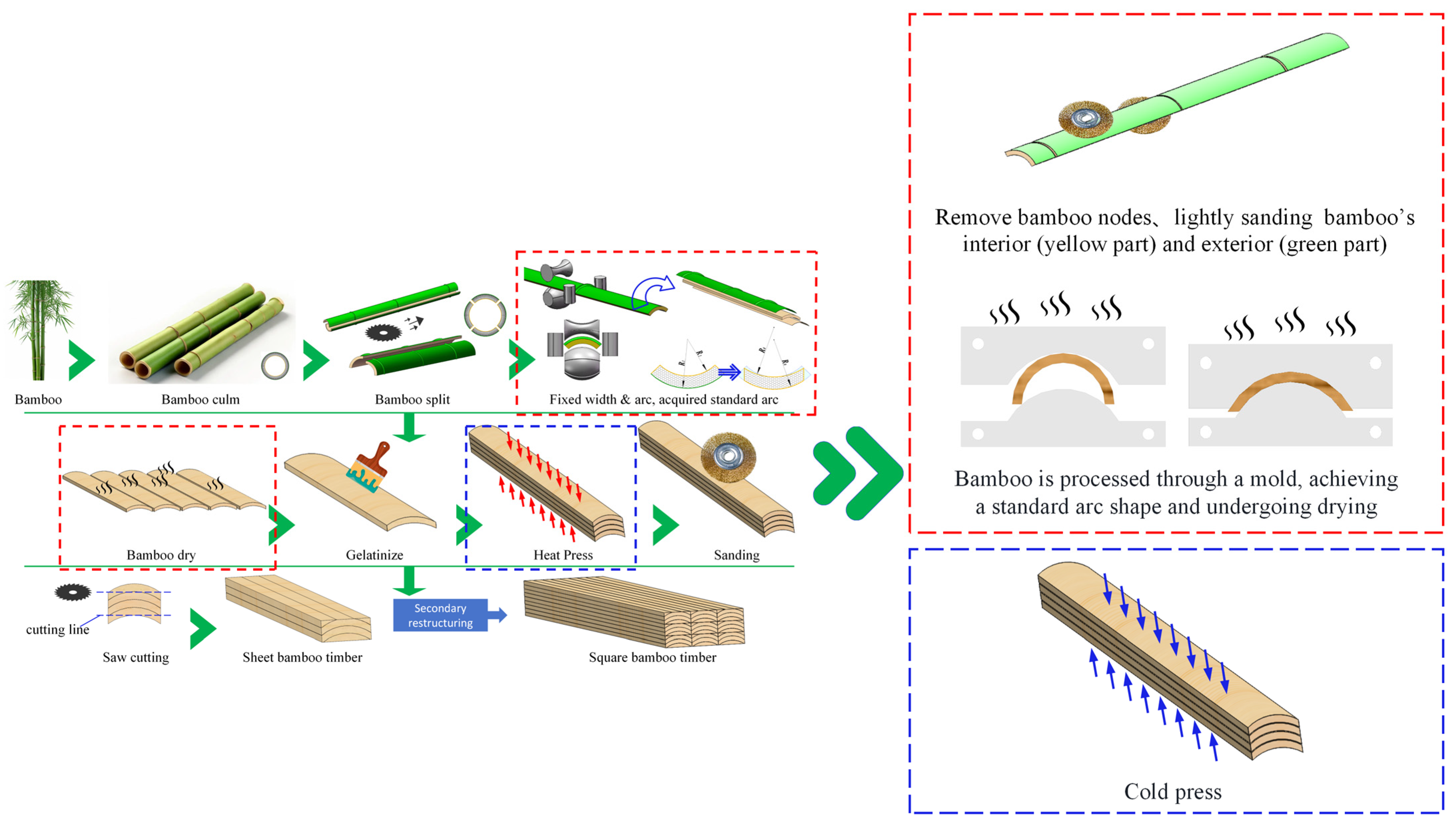 - Wang, X.; Chen, X.; Shang, L.; Chen, L.; Huang, B.; Ma, X.; Fei, B.; Liu, H.; Fang, C. A straightforward and efficient gradient pressure method for bamboo flattening: Strain and multi-scale deformation. Compos. Part B Eng. 2024, 272, 111232. [Google Scholar] [CrossRef]
