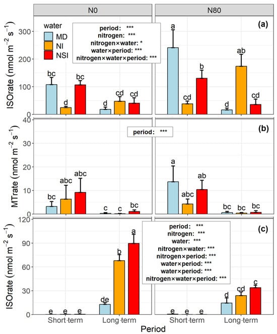 Standardized isoprene emission rate (ISOrate) and monoterpene emission rate (MTrate) of O. pinnata (a) and P. massoniana (b,c) under three water levels (MD, NI, and NSI) and two nitrogen levels (N0, N80) across two sampling periods (short-term and long-term). Values are means ± SD (n = 3). Different letters for a given species indicate significant differences among all bars (Tukey’s HSD test, p < 0.05). Asterisks (*, ***) indicate significant effects for p < 0.05 and p < 0.001, respectively (non-significant effects are not displayed).