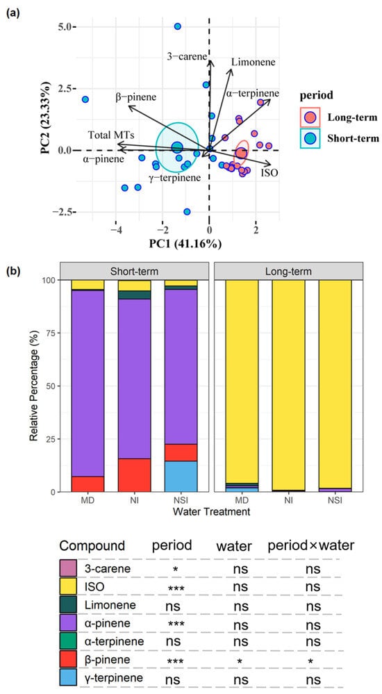 Principal component analysis (PCA) of BVOC emissions from P. massoniana. (a) PCA score plot of different BVOCs across sampling periods. Red and blue symbols represent short-term and long-term sampling groups, respectively. The percentage of variance explained by each principal component (PC) is indicated. (b) Contribution of ISO and individual monoterpenes to total BVOC emissions after short-term and long-term water and nitrogen treatments. Total MTs denote the sum of the six monoterpenes listed. The asterisks * and *** indicate significance at p < 0.05 and p < 0.001, respectively, and “ns” indicates non-significance.