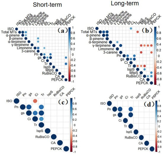 Correlations between different BVOC emissions and leaf physiological and biochemical parameters of P. massoniana (a,b) and O. pinnata (c,d) after short-term and long-term water and nitrogen treatments. The colors represent the coefficient of correlation between each pair of variables, where blue represents significant positive correlation and red represents significant negative correlation. Statistical significance was set at p < 0.05. ISO, isoprene; Total MTs, total monoterpenes; Pn, net photosynthetic rate; gs, stomatal conductance; Ci, intercellular CO2 concentration; Tr, transpiration rate; IspS, isoprene synthase; MtpS, monoterpene synthase; RuBisCO, ribulose-1,5-bisphosphate carboxylase/oxygenase; CA, carbonic anhydrase; PEPCK, phosphoenolpyruvate carboxykinase.