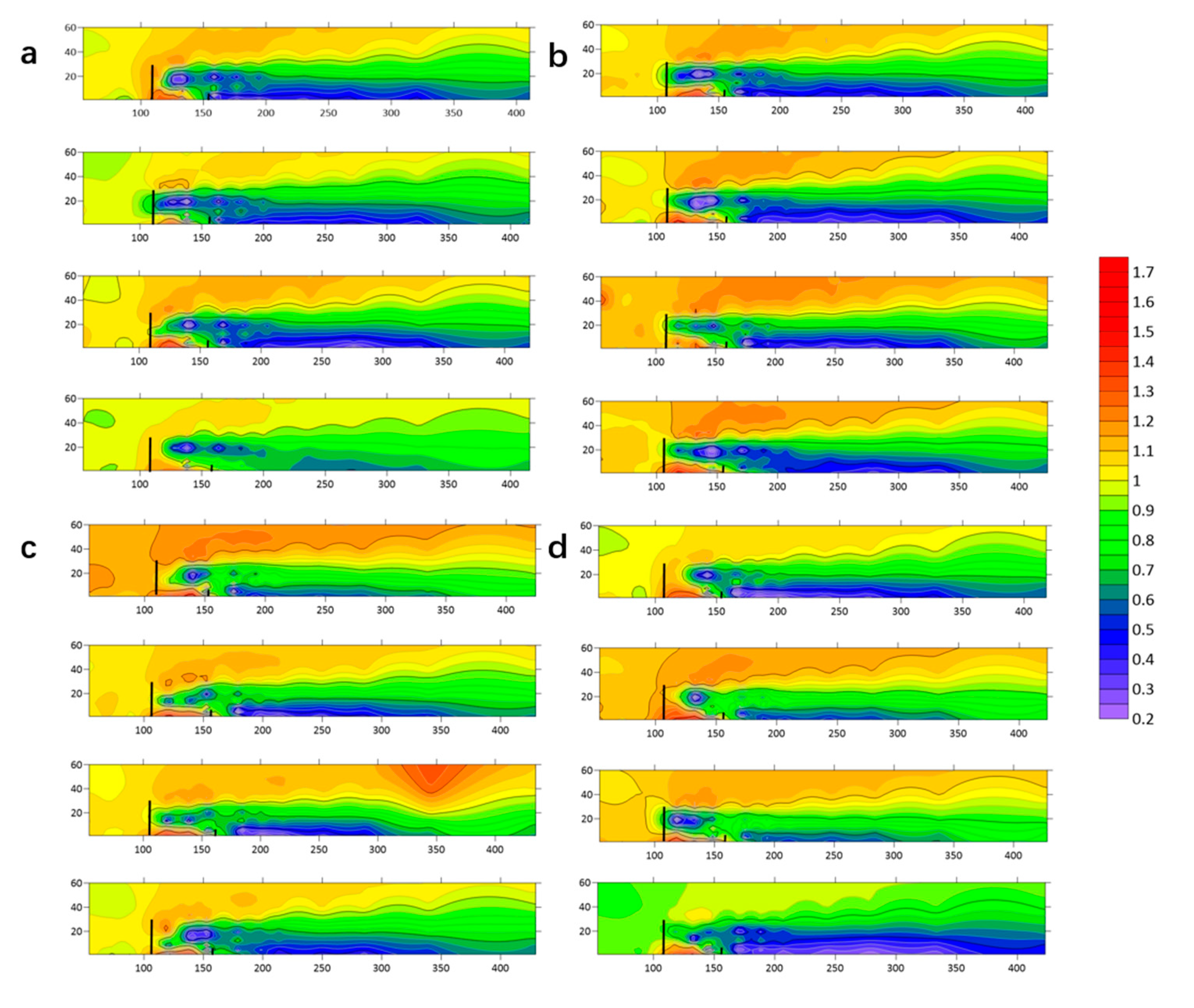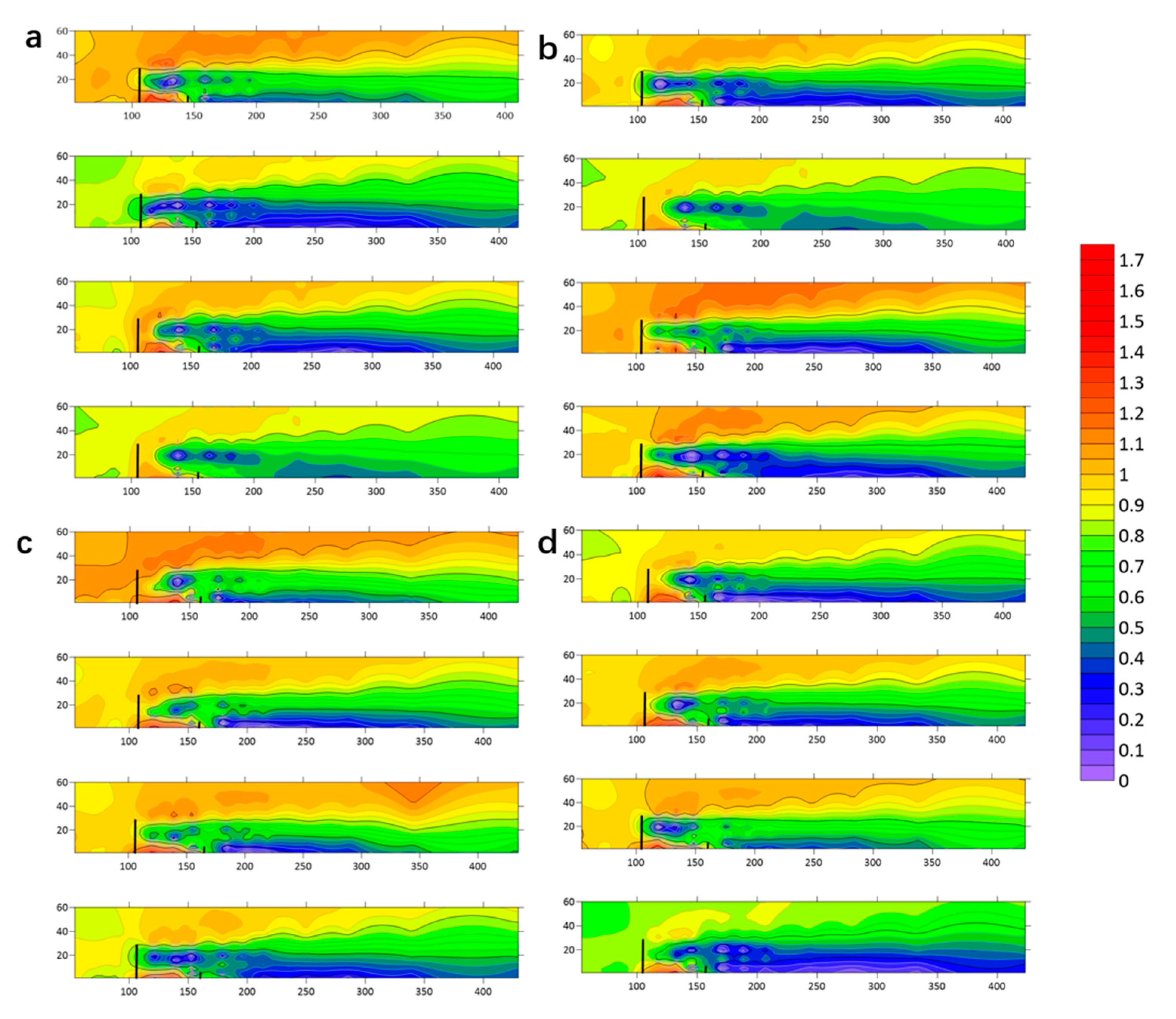 3.2.2. Flow Field Analysis of Different Tree-Shrub Windbreak and Sand-Fixing Forests at 10 m s−1