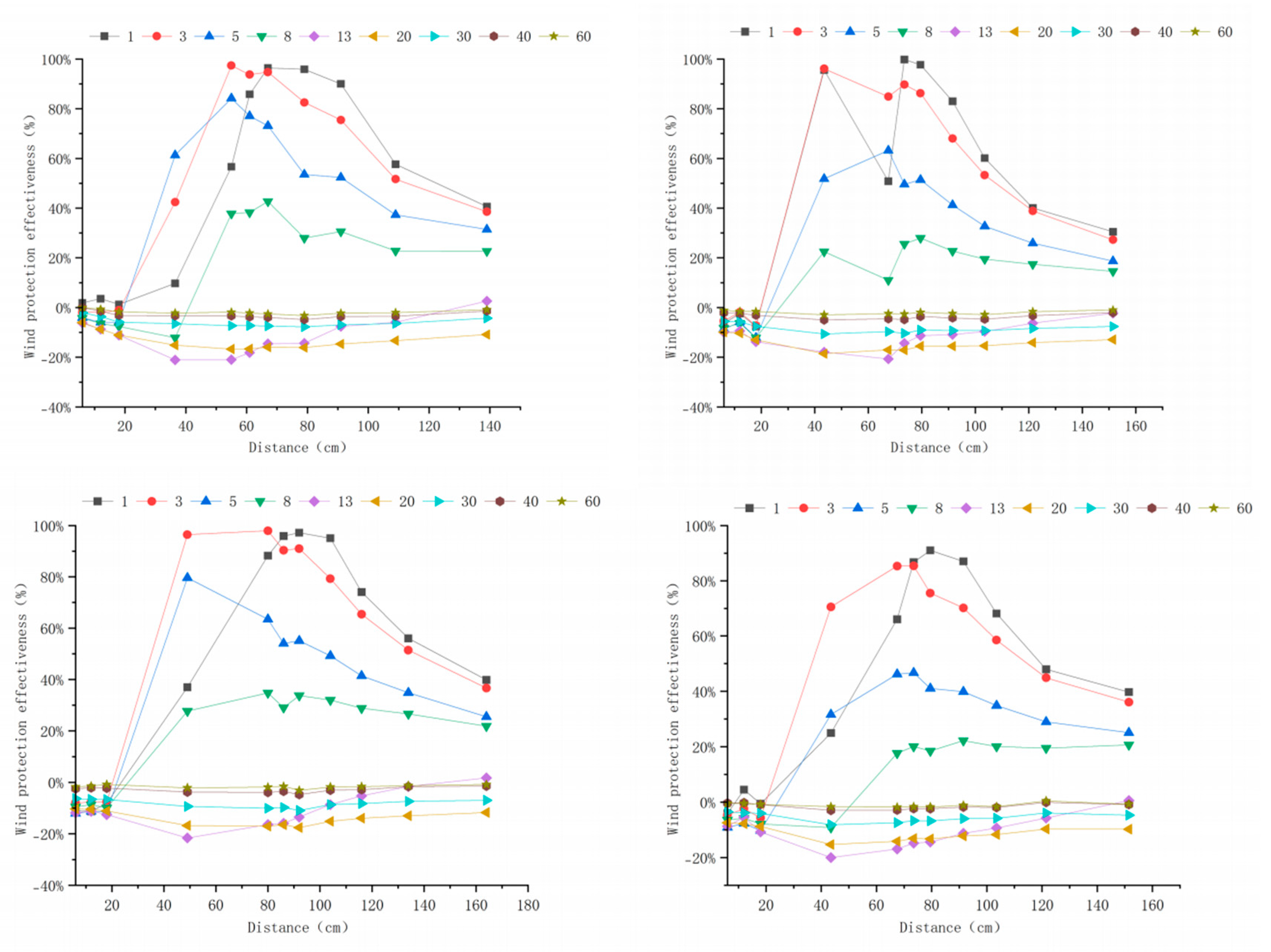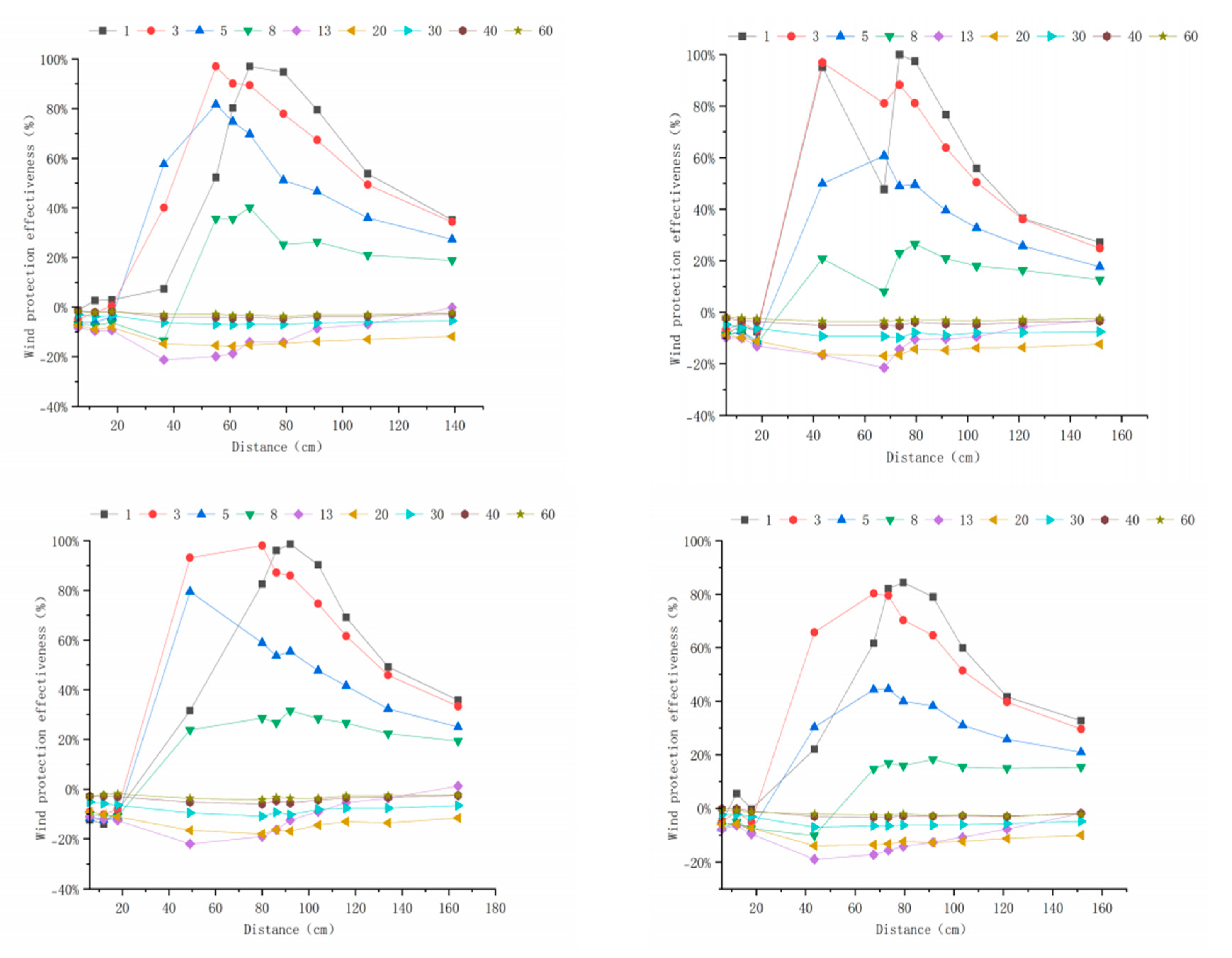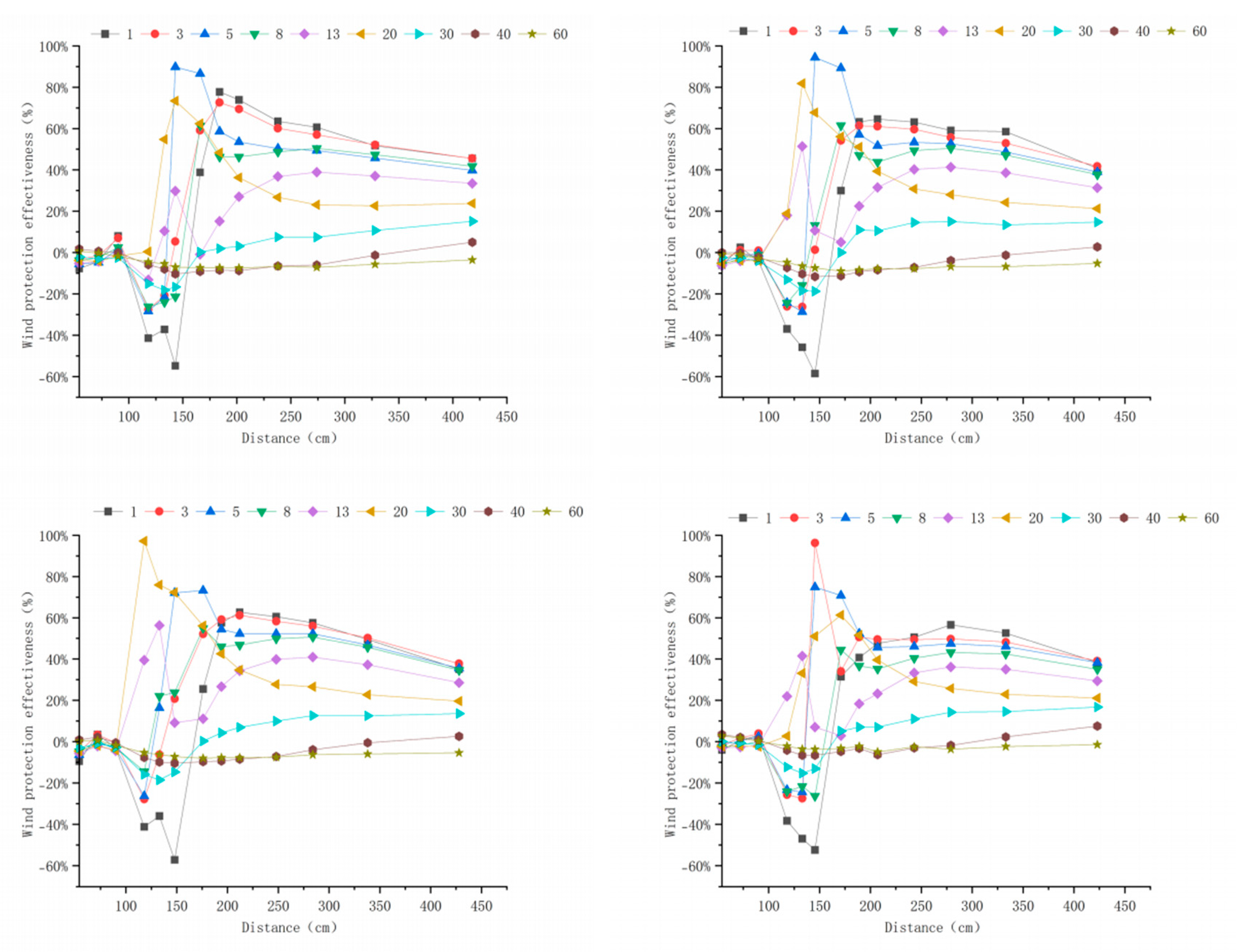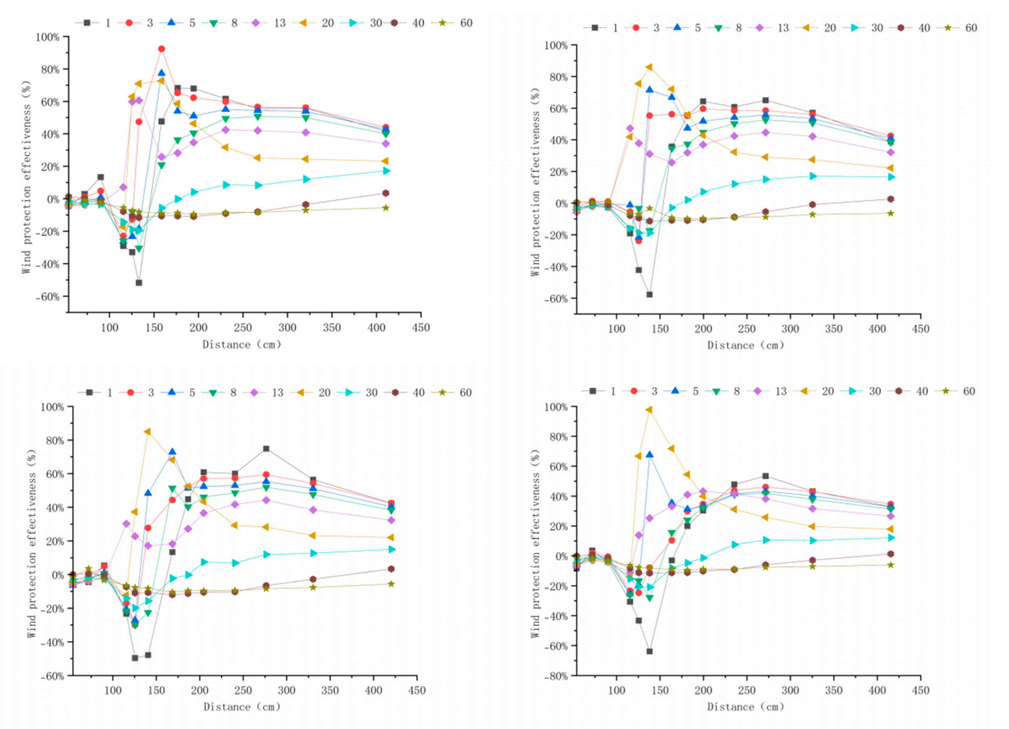 - The key to its high-efficiency protection lies in the vertical complementarity of the mixed tree-shrub system: trees reduce upper-layer wind speeds and lift airflow, while shrubs effectively lower near-surface wind speeds, forming a layered protection mechanism that significantly extends the effective distance of the protective strip.