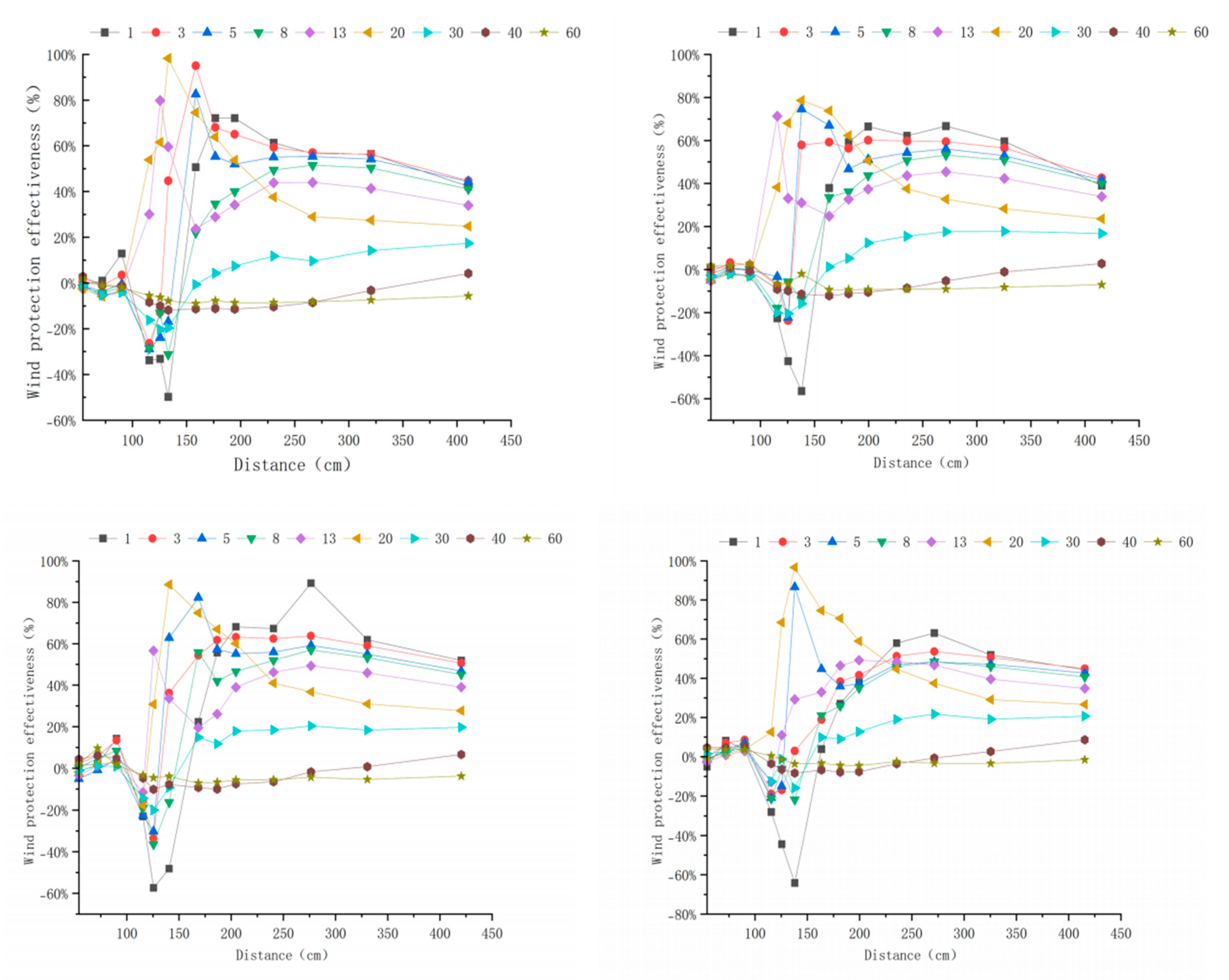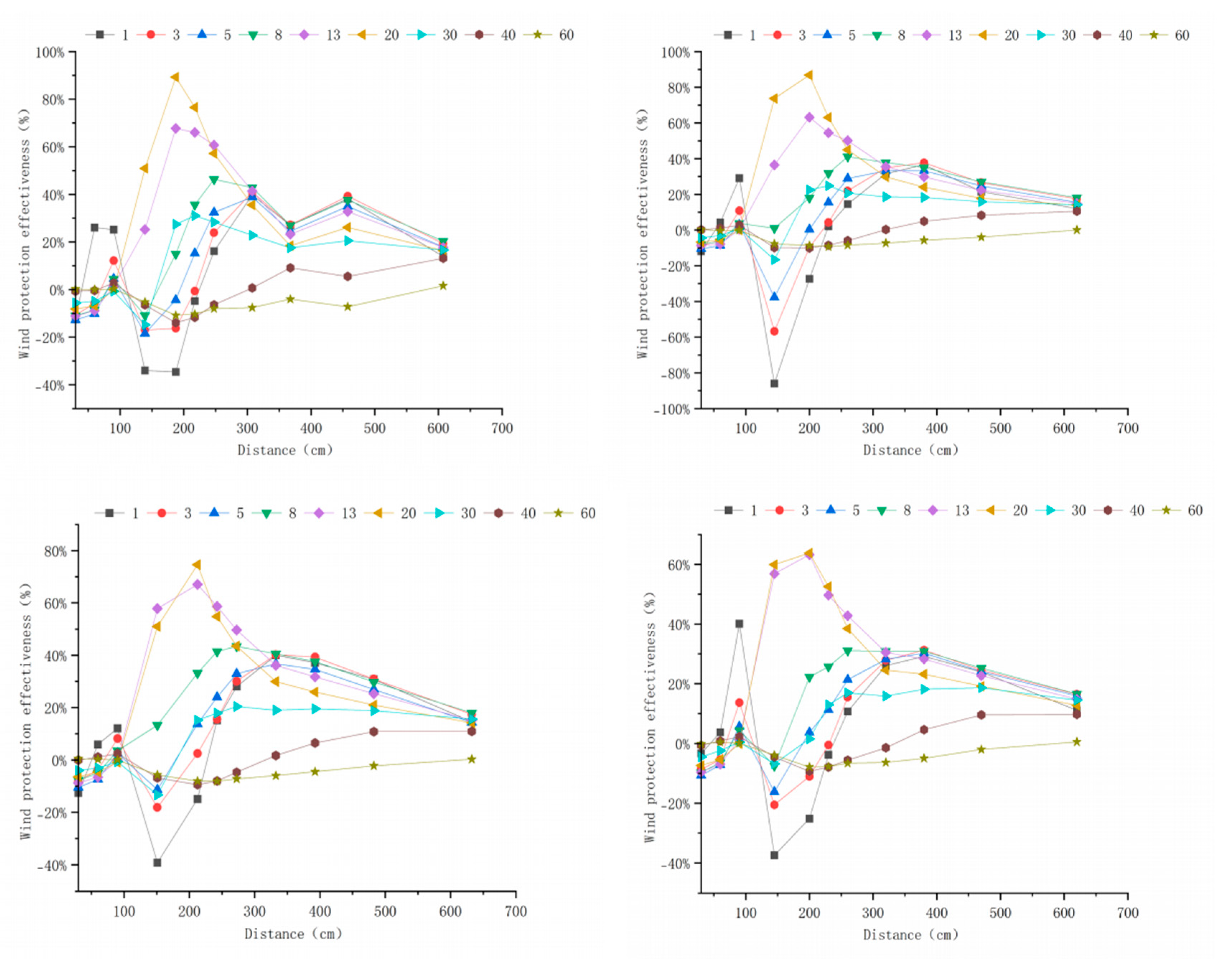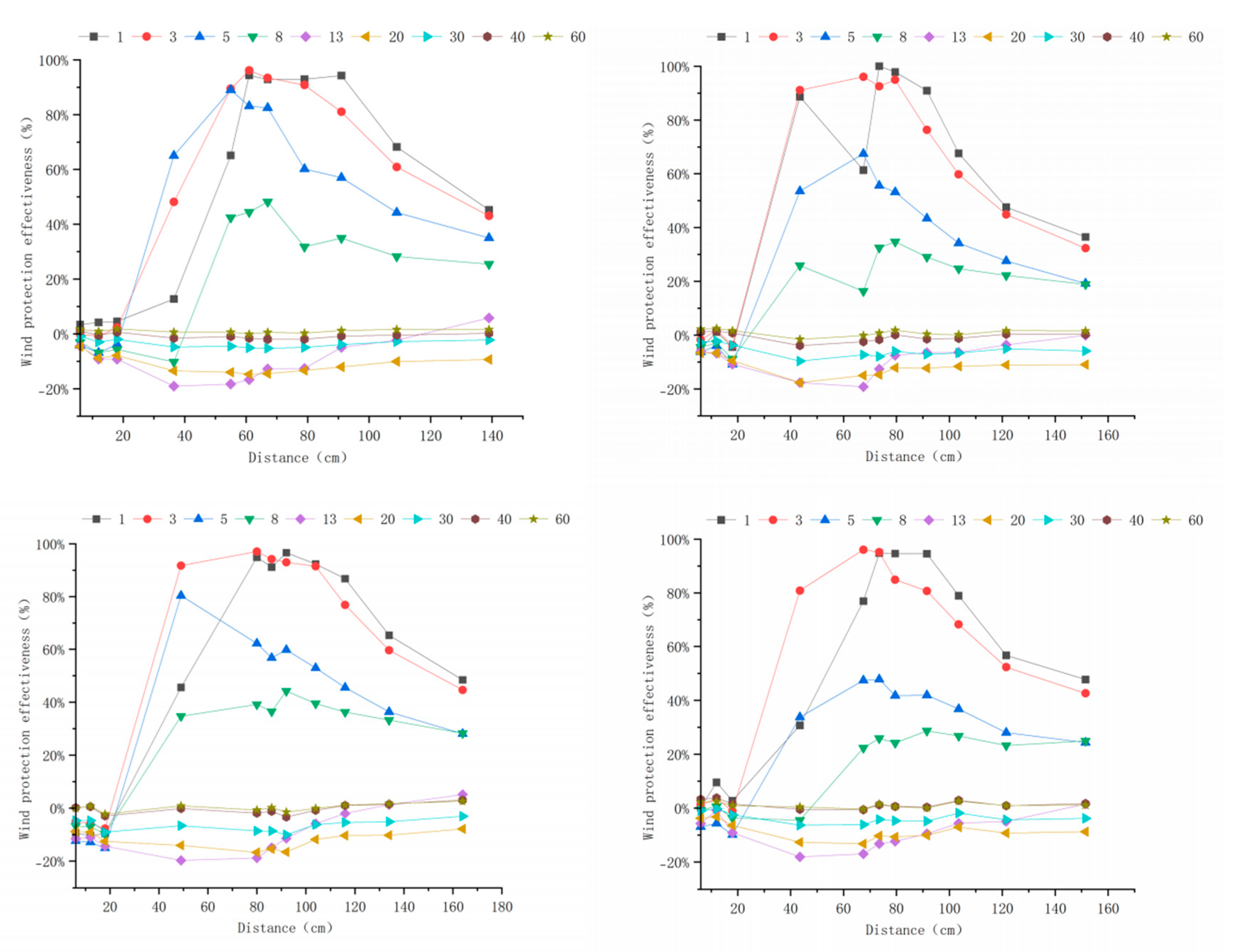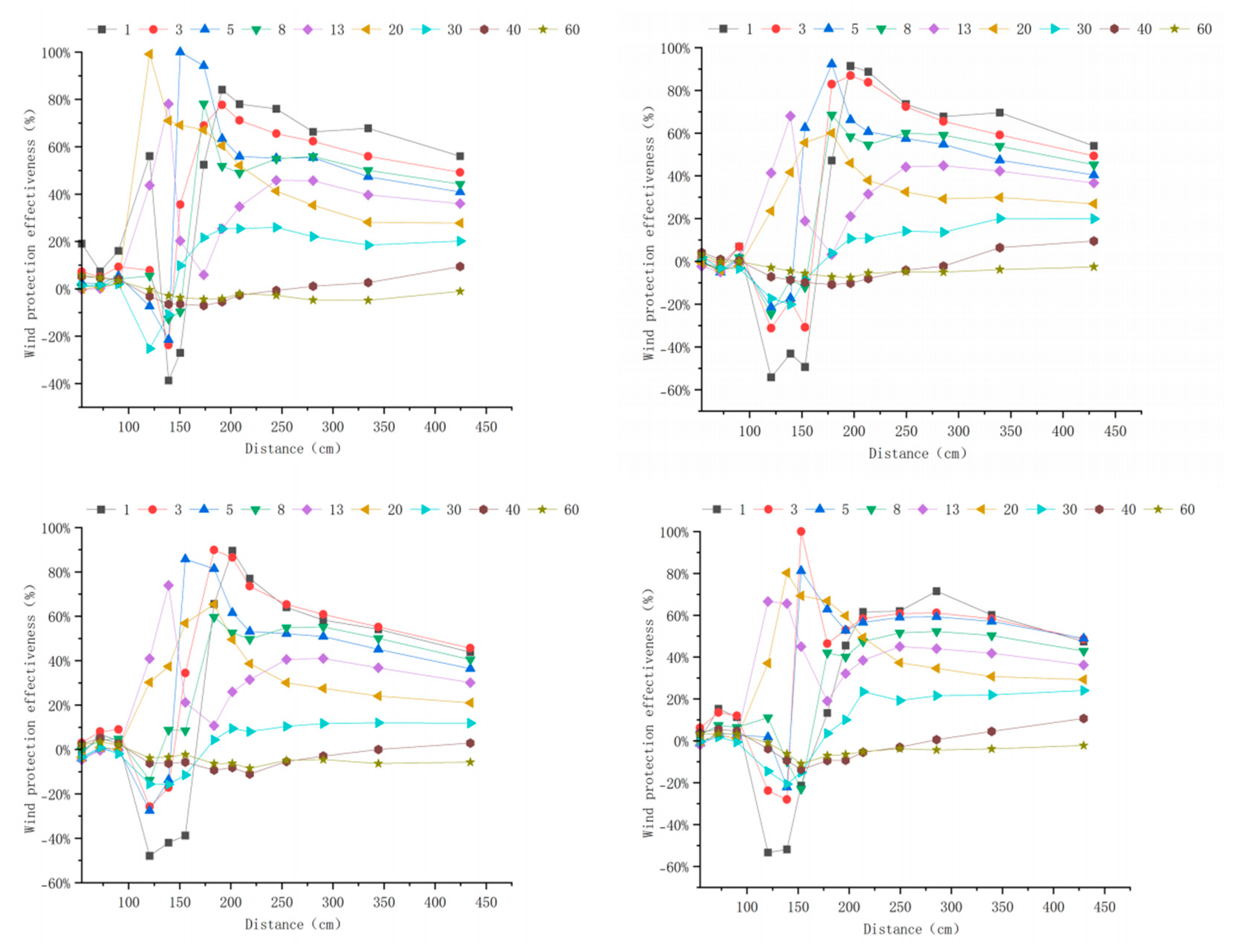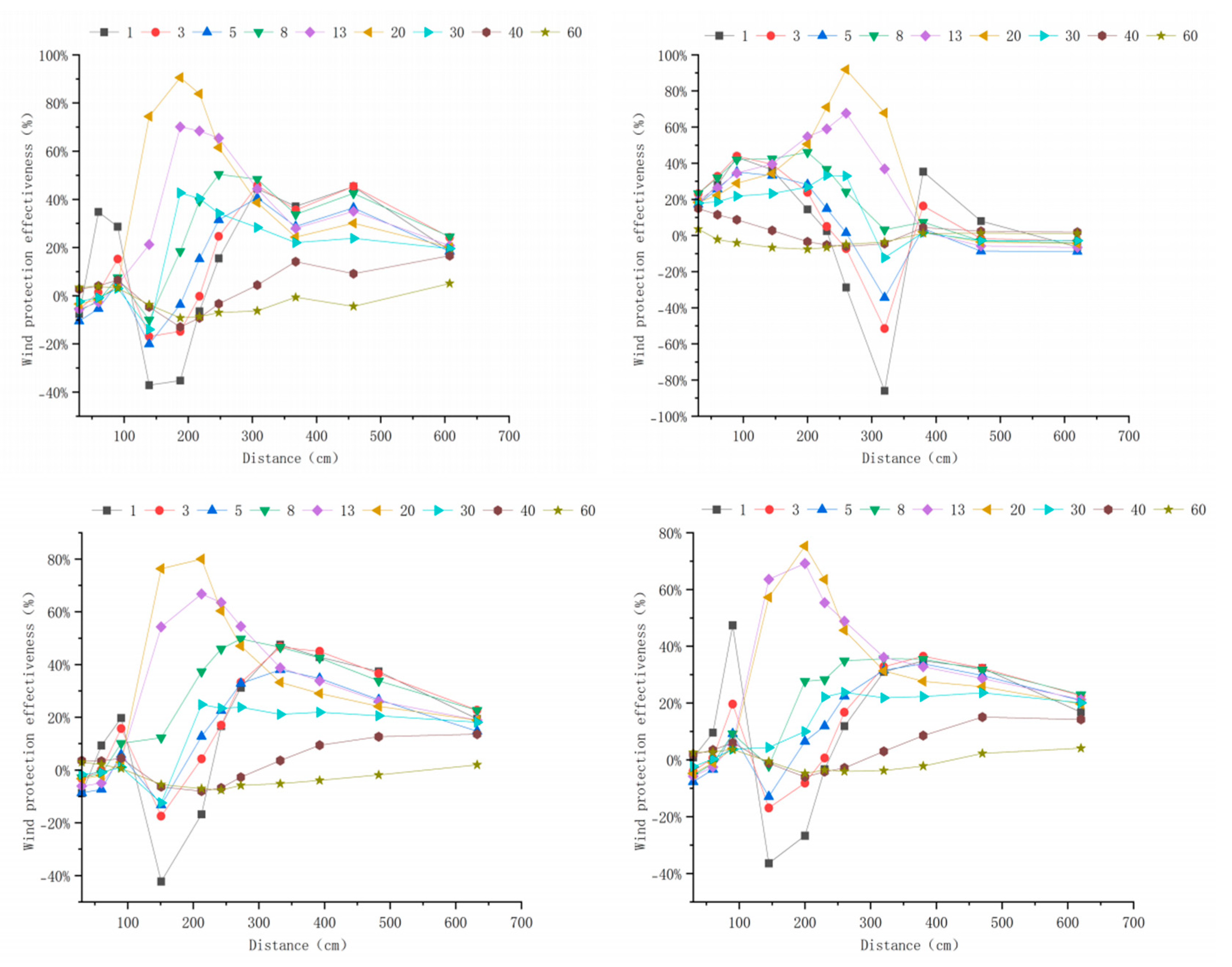 - The key to its high-efficiency protection lies in the vertical complementarity of the mixed tree-shrub system: trees reduce upper-layer wind speeds and lift airflow, while shrubs effectively lower near-surface wind speeds, forming a layered protection mechanism that significantly extends the effective distance of the protective strip.