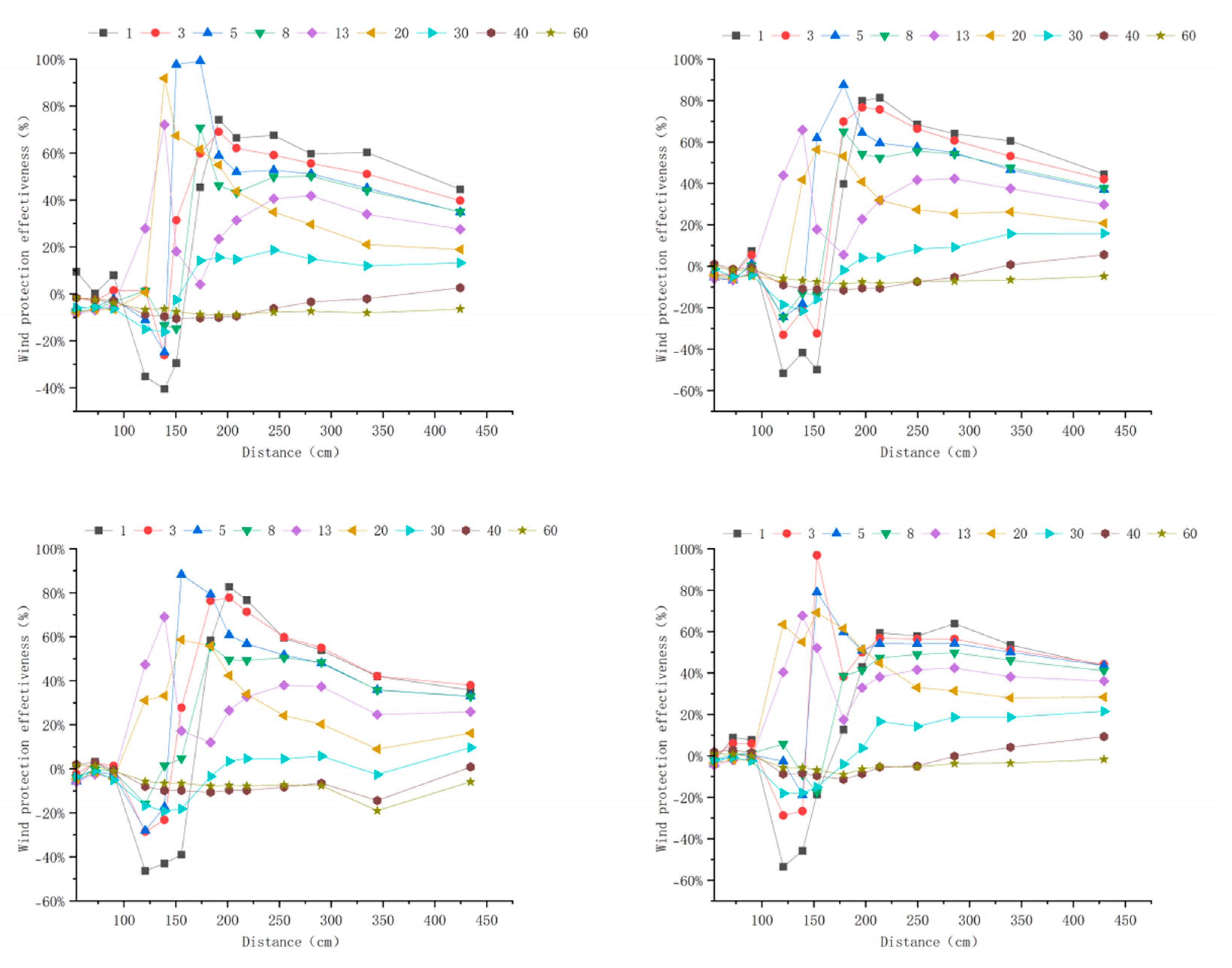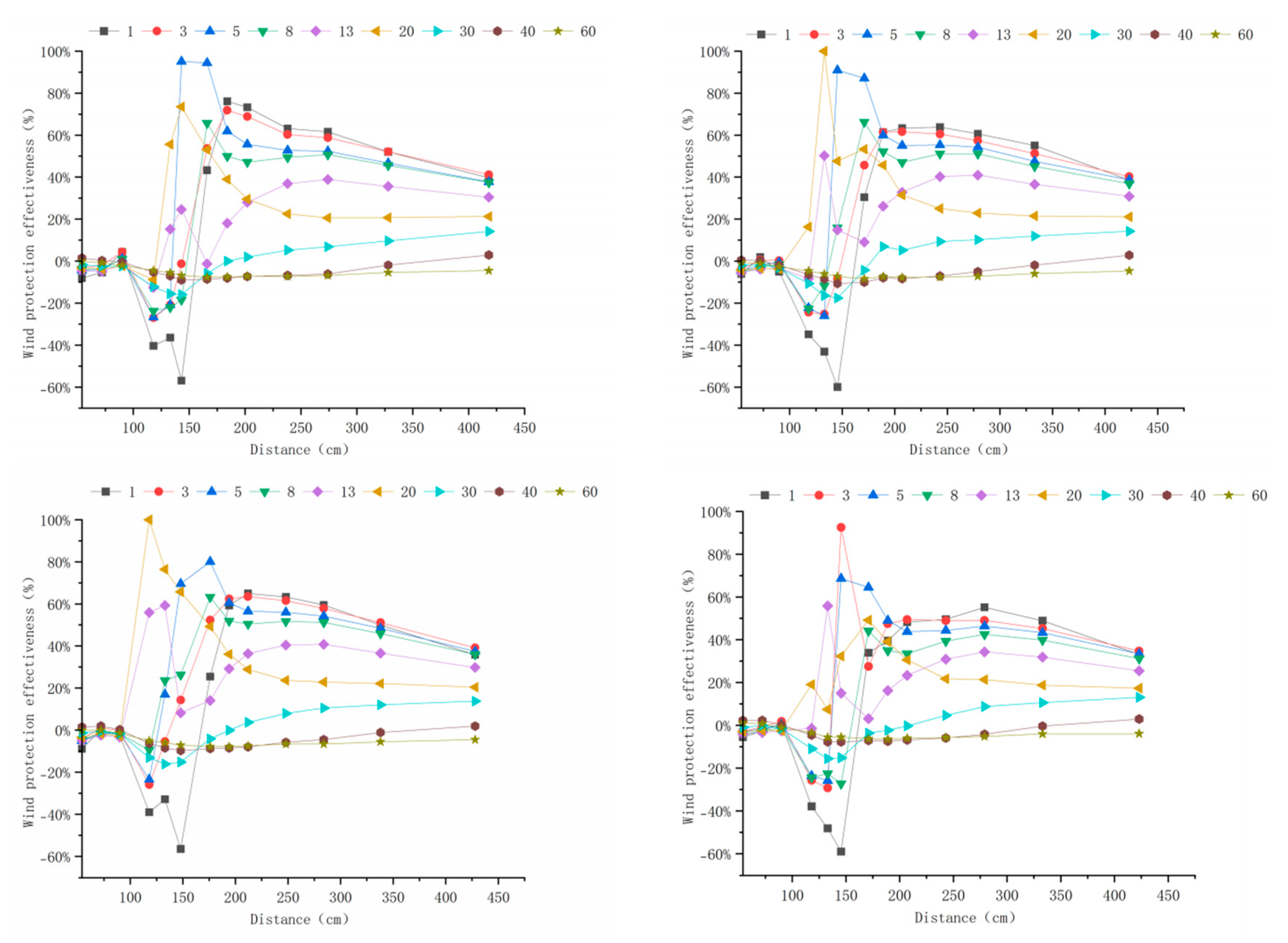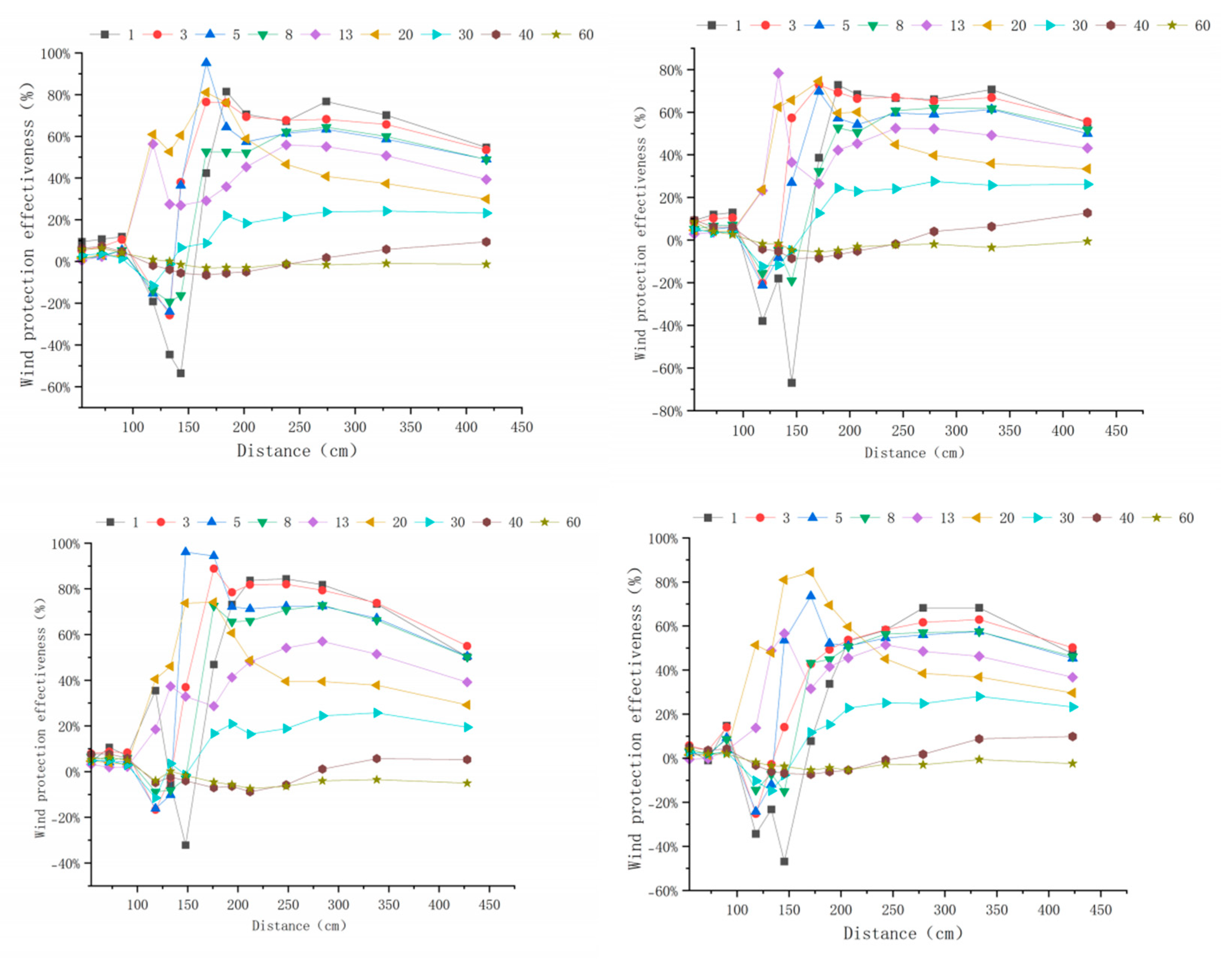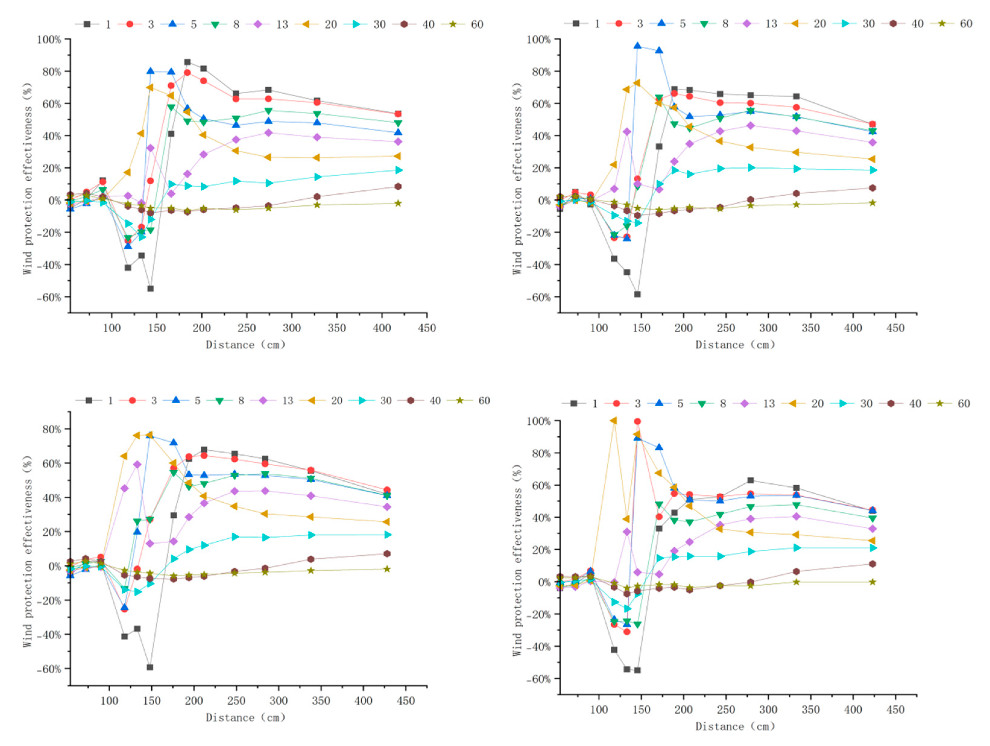 3.3.2. Windbreak Efficiency Analysis at 10 m s−1