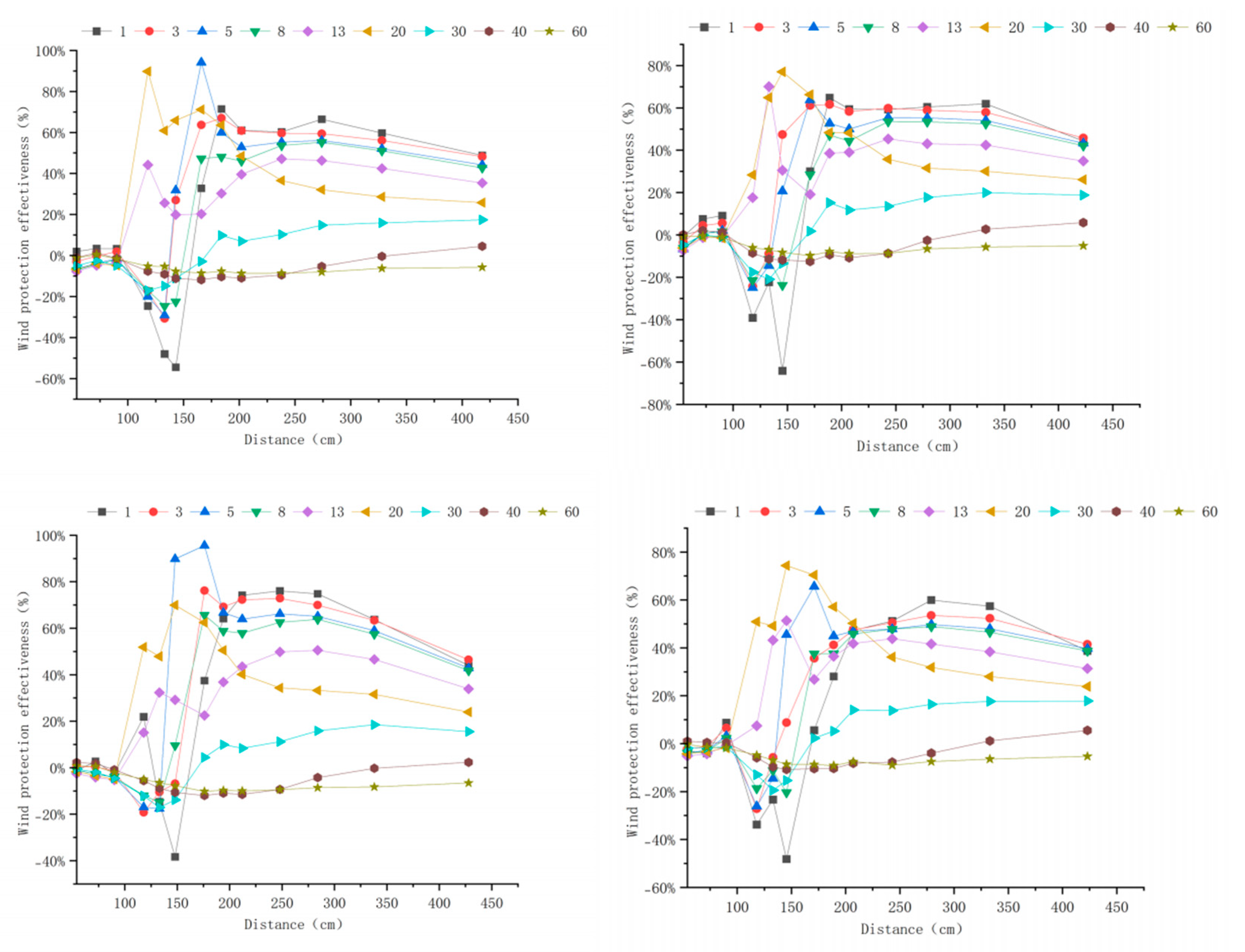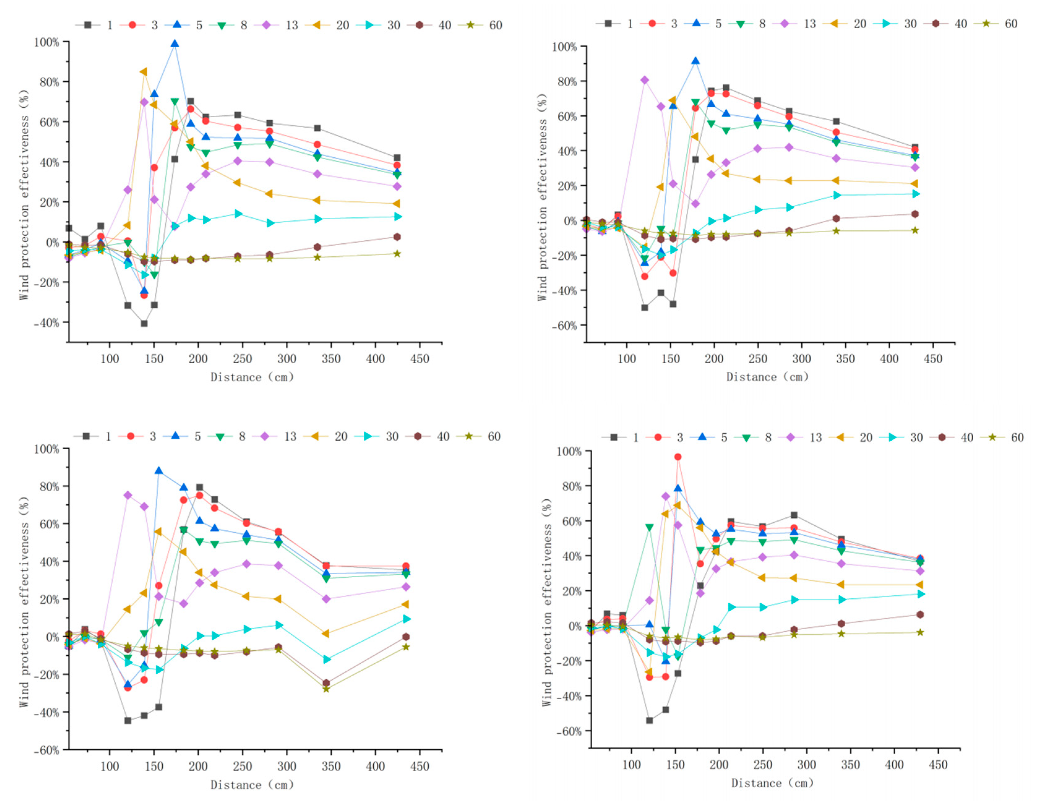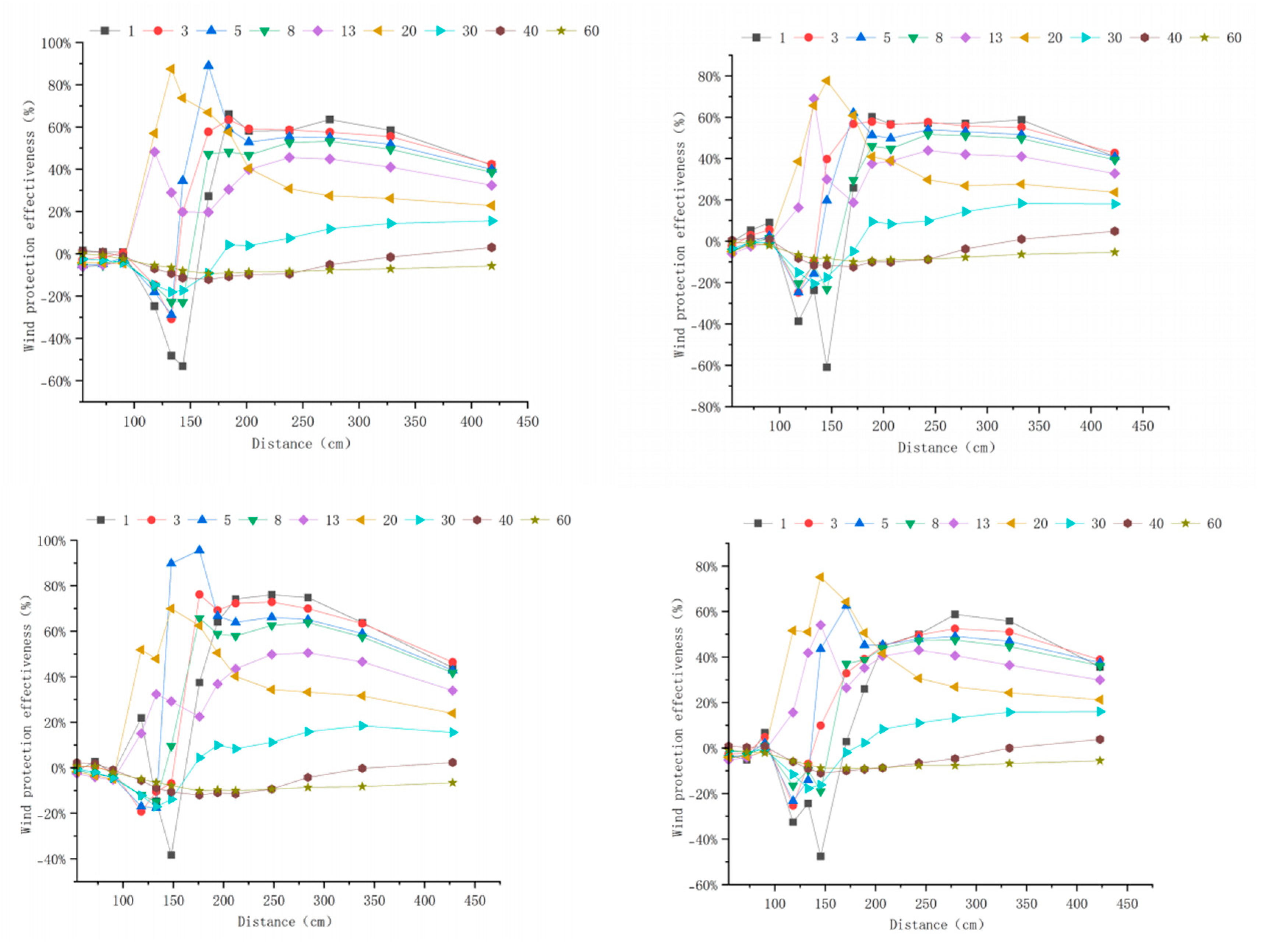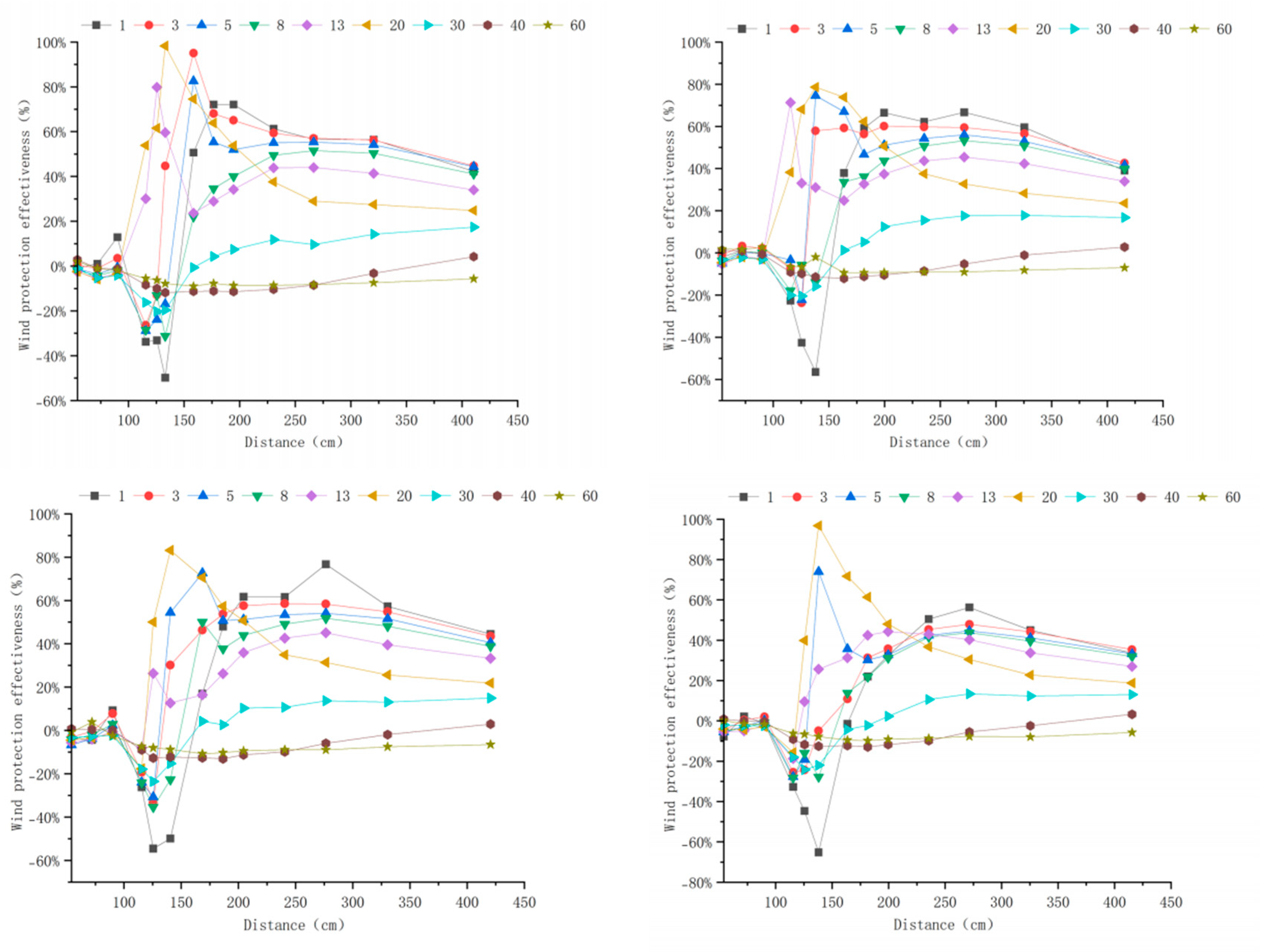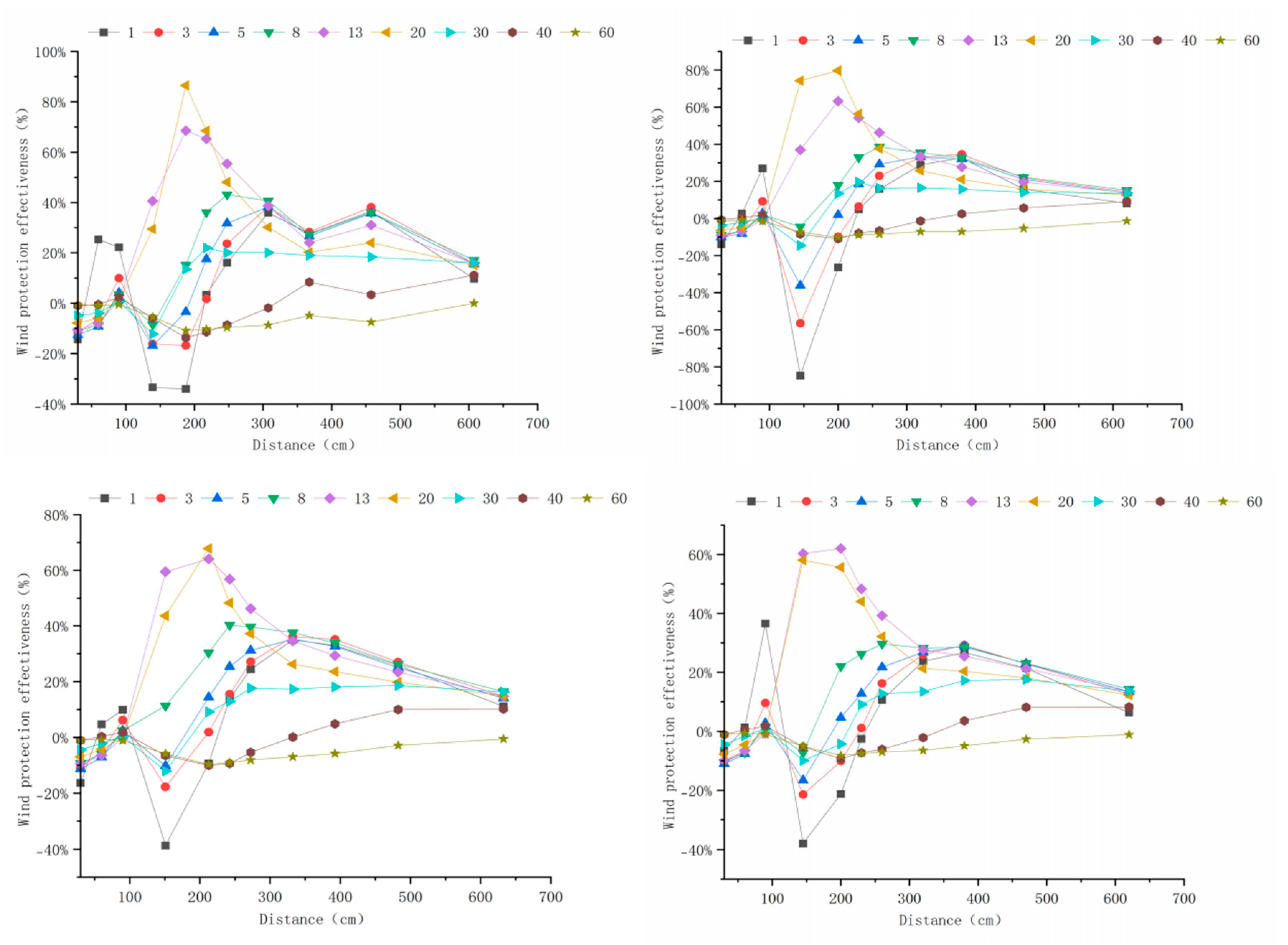 3.3.2. Windbreak Efficiency Analysis at 10 m s−1
