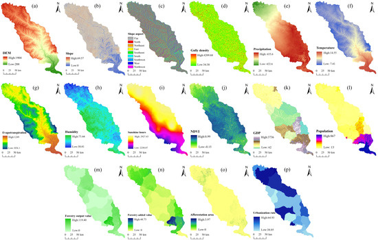 Factors affecting the carbon sequestration service function of the forest ecosystem in the Beiluo River Basin. Note: (a) DEM; (b) Slope; (c) Slope aspect; (d) Gully density; (e) Precipitation; (f) Temperature; (g) Evapotranspiration; (h) Humidity; (i) Sunshine hours; (j) NDVI; (k) GDP; (l) Population; (m) Forestry output value; (n) Forestry added value; (o) Afforestation area; (p) Urbanization rate.