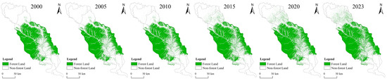 Spatial distribution pattern of forest land in the Beiluo River Basin from 2000 to 2023.