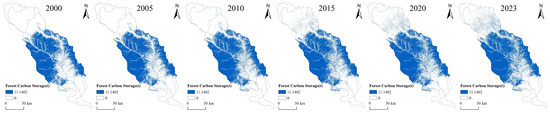 As shown in Figure 3 and Figure 4, from 2000 to 2023, the spatial patterns of forest land and forest carbon sequestration services in the Beiluo River Basin evolved in tandem, exhibiting the characteristic of “strengthening the ecological foundation and enhancing carbon sequestration capacity”. From a spatial perspective, the middle reaches, with their river valleys and gentle mountain terrain offering favorable water and heat conditions and soil conservation advantages, have long served as the core area for forest land, acting as the foundational carrier for the basin’s forest carbon sink. The carbon sequestration service function of forests has also been concentrated in this region due to the stable development of forests in the middle reaches. From a temporal perspective, forest land across the entire basin has shown a sustained expansion trend, with particularly notable increases in the upper reaches. From 2000 to 2023, forest land patches in the upper reaches extended deeply into the northern and northwestern regions, simultaneously driving the expansion of forest carbon sequestration services, with carbon sequestration blank zones in the upper reaches gradually shrinking. This change is closely linked to the Grain-for-Green Program. After the program’s implementation, the upstream region converted vulnerable non-forest land into forest land through slope farmland afforestation and barren mountain afforestation, thereby restoring the fragile ecological space in the upstream region while enhancing carbon sink capacity through forest growth. From the perspective of spatial pattern evolution, over time, the distribution of forest land and forest carbon sequestration services shifted from “concentrated in the middle reaches with scattered areas in the upper and lower reaches” to “stable core in the middle reaches, significant increases in the upper reaches, and gradual expansion across the entire basin”, reflecting the synergistic effectiveness of ecological engineering and natural restoration. Forest nurturing and management in the middle reaches maintain stable carbon sequestration levels, while newly added forest land in the upper reaches gradually forms scaled carbon sequestration services, continuously strengthening the carbon sequestration foundation of the watershed ecosystem.