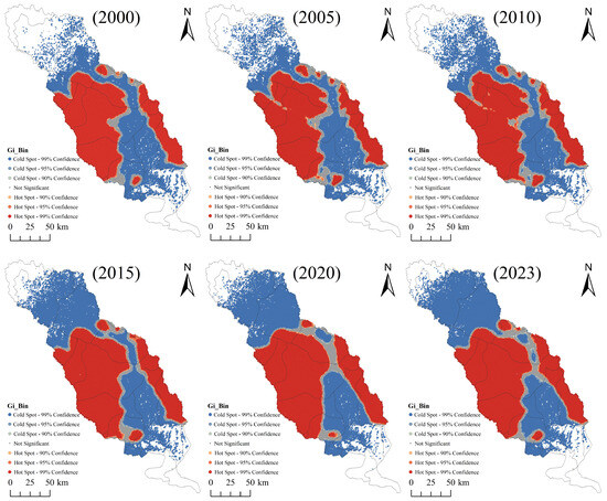 Using ArcGIS, a hotspot map of forest ecosystem carbon sequestration services for the period 2000–2023 was generated to characterize spatial relationships (Figure 6). The study area exhibits significant localized clustering of forest carbon sequestration services. From a spatial differentiation perspective, hotspot regions have long been concentrated in the rocky mountain forest area, which features complex terrain, high potential for natural vegetation recovery, and priority implementation of afforestation projects, making it the core zone for high-value carbon sequestration clustering; Cold spot areas are concentrated in hilly gully regions, high plateau gully regions, and terrace plain regions. Hilly gully regions suffer from severe soil erosion and fragile ecological foundations, high plateau gully regions have fragmented terrain that limits vegetation growth, and terrace plain regions are strongly impacted by human activities such as agricultural development and urban construction, resulting in low forest coverage and weak carbon sequestration capacity, leading to the aggregation of cold spots. From a temporal evolution perspective, the hotspot and coldspot patterns from 2000 to 2023 exhibit a trend of “hotspot expansion-coldspot contraction-boundary optimization”. From 2000 to 2010, the hotspot area in the rocky mountain forest region expanded slowly, benefiting from the initial implementation of the Grain-for-Green Program; From 2010 to 2020, the cold spot areas in the hilly and gully regions saw their carbon sequestration gaps gradually filled due to the deepening of ecological restoration projects, resulting in a reduction in the cold spot range; from 2020 to 2023, the internal aggregation of hot spots further intensified, and the boundary between cold spot and hot spot regions became more distinct. Overall, the evolution of forest carbon sequestration service hotspots in the Beiluo River basin is based on topographical zoning, with ecological projects and natural recovery synergistically driving the evolution of the pattern. The Tushishan Forest Area has maintained its hotspot status through the synergistic advantages of natural and artificial factors; cold spot areas have gradually improved with the advancement of ecological restoration, providing direct spatial evidence for the enhancement of forest ecosystem carbon sequestration services in the basin.