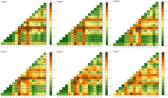 The explanatory variables were imported into the Geodetector model to obtain the q values representing the influence of each explanatory variable on the spatiotemporal evolution of the carbon sequestration service function of the forest ecosystem in the Beiluo River Basin. The results (Table 6) show that all 16 independent variables passed the significance test at the 0.05 level, indicating that the spatiotemporal evolution of the carbon sequestration service function of the forest ecosystem in the study area is the result of the combined effects of topographical factors, natural ecological factors, and socioeconomic factors. From 2000 to 2023, the magnitude of the influencing factors on the spatial pattern of the carbon sequestration service function of the forest ecosystem was as follows: X7 > X10 > X8 > X5 > X9 > X6 > X1 > X11 > X14 > X13 > X16 > X12 > X15 > X2 > X3 > X4, indicating that natural ecological factors play a dominant role in the spatiotemporal evolution of the carbon sequestration service function of the forest ecosystem, Socioeconomic factors play an important role in the spatiotemporal evolution of forest carbon sequestration within the study area, while topographic factors have a relatively weaker influence.