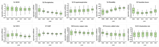 Figure 8 illustrates the temporal evolution patterns of regression coefficients for each influencing factor obtained from the GTWR model between 2000 and 2023. Box plots provide information on the median, mean, data distribution range, and distribution pattern. This paper uses box plots to describe the mean distribution of GTWR regression coefficients for each factor in order to analyze the time non-stationarity of the impact of each factor on the carbon sequestration service function of the forest ecosystem in the Beiluo River Basin (Figure 8).
