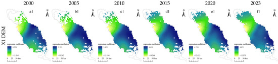 From 2000 to 2023, the NDVI regression coefficient remained positive over the long term, indicating that it continued to have a positive effect on carbon sequestration. From 2000 to 2010, high-value areas were concentrated in the central forest region with high vegetation coverage, and the coefficient gradient was clear, reflecting that the synergistic effect between NDVI and carbon sequestration was more significant in areas with good ecological conditions. Over time, the range of high-value areas has steadily expanded, with coefficients in the central and southern forest regions continuing to rise, while low-value areas have gradually contracted, indicating that NDVI’s driving effect on carbon sequestration has strengthened with ecosystem succession. From 2020 to 2023, the distribution of coefficients has become more homogeneous, with high-value areas showing increased coverage and stable intensity, highlighting NDVI’s role as a core ecological indicator in enhancing carbon sequestration services through a key and stable positive influence.