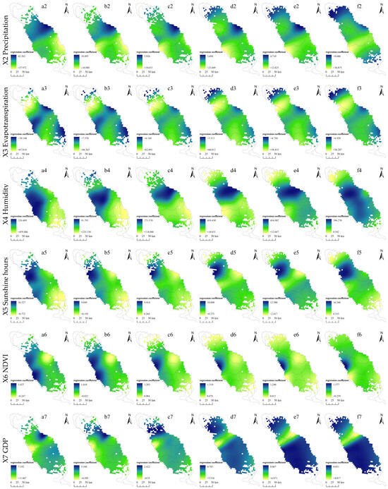 To further conduct local spatial regression analysis using the GTWR model (10.8.1), we implemented rigorous variable screening in two steps prior to modeling to ensure the robustness and interpretability of GTWR results. First, we utilized the q-statistic from the geodetector to evaluate the independent explanatory power of 16 initial influencing factors on the spatial pattern of forest carbon sequestration services. Subsequently, we set a q-value threshold (q < 0.1) to eliminate factors with weaker explanatory power [51]. This process retained 11 factors with strong influence from the initial set. Second, to eliminate the interference of multicollinearity among variables on subsequent GTWR model coefficient estimates, we introduced an independent preprocessing step before constructing the GTWR model: conducting multicollinearity diagnostics using stepwise linear regression [52]. The diagnostic criterion for severe multicollinearity was set as VIF ≥ 10. Analysis revealed that the VIF value for the annual mean temperature (X6) factor exceeded 10, leading to its exclusion from the final model. Following these two screening stages, ten influencing factors were retained for GTWR analysis: DEM (X1), precipitation (X2), annual average evapotranspiration (X3), humidity (X4), sunshine duration (X5), NDVI (X6), GDP (X7), forestry output value (X8), forestry value-added (X9), and urbanization rate (X10). This process ensures that the variables entering the model significantly influence the dependent variable while remaining relatively independent from each other, thereby providing a reliable foundation for subsequent analysis of the spatio-temporal non-stationarity of regression coefficients.