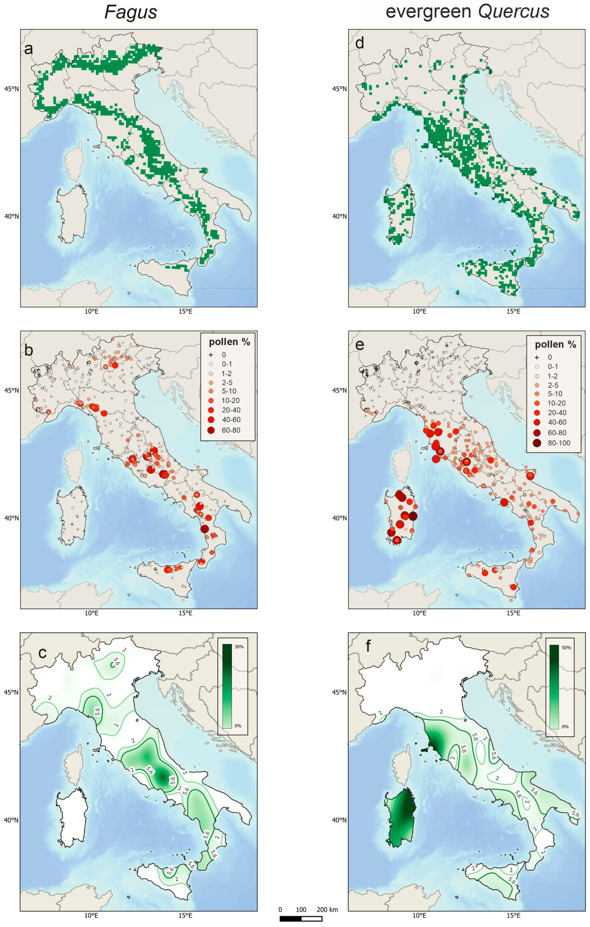 5.4. Occurrence Maps and Bayesian Modelling on Modern Pollen Deposition Data: An Example for Two Forest Tree Taxa (Fagus and Evergreen Quercus)