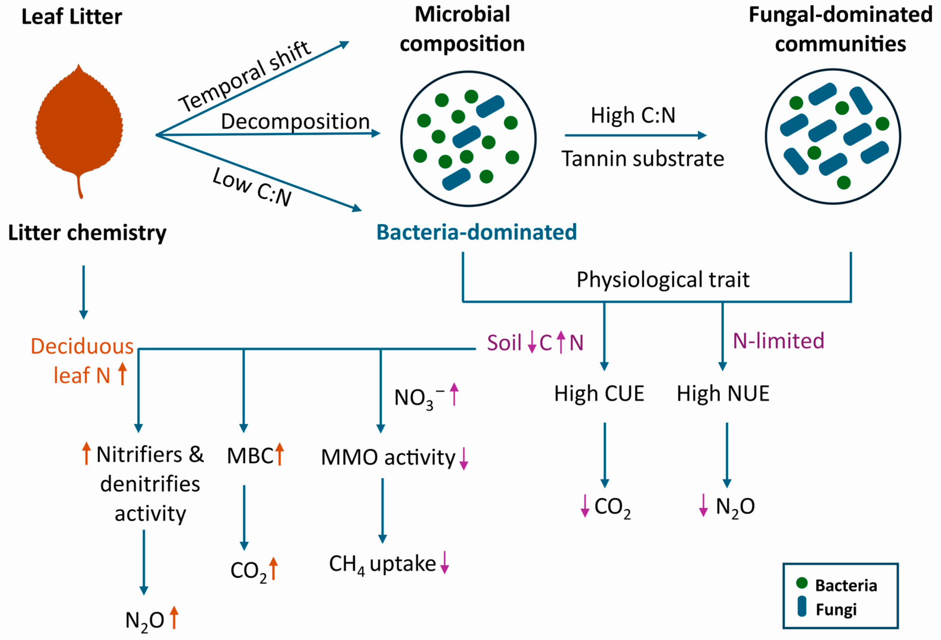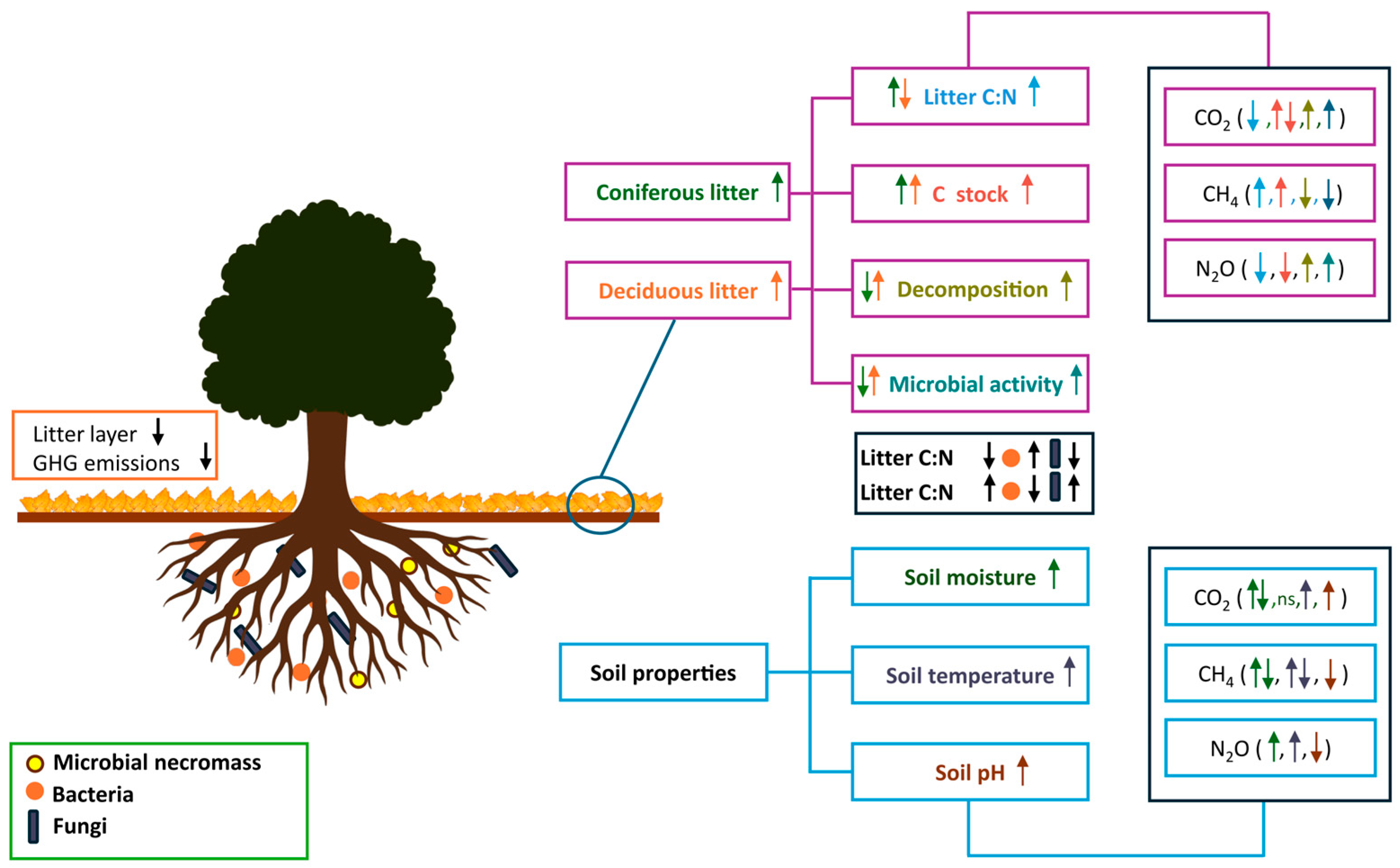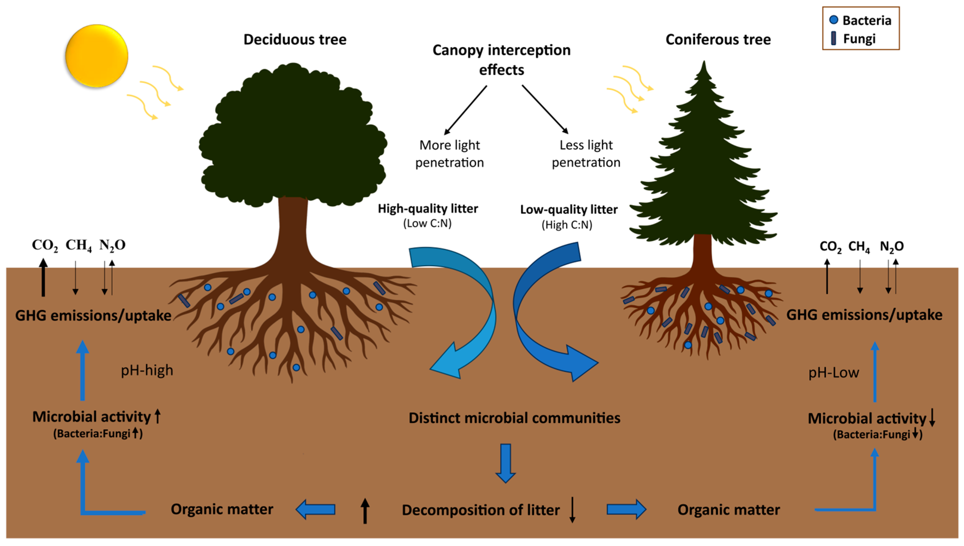 - How does litter quality, influenced by tree species composition, shape soil C and N dynamics and soil microbial activity, ultimately leading to different GHG flux rates?