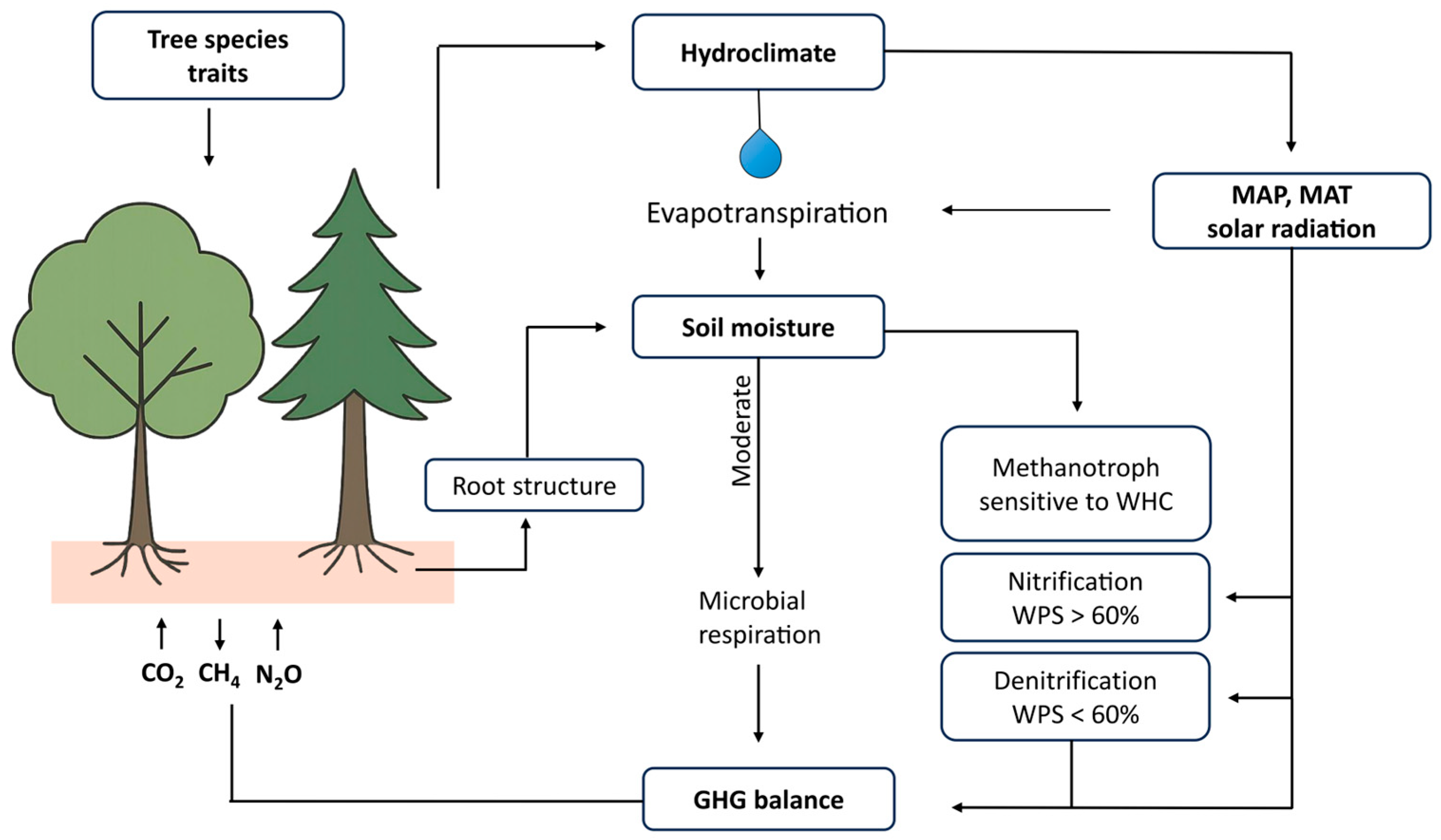 - How do physicochemical factors related to forest soils (e.g., temperature, moisture, pH, and nutrient availability) influence GHG fluxes?
