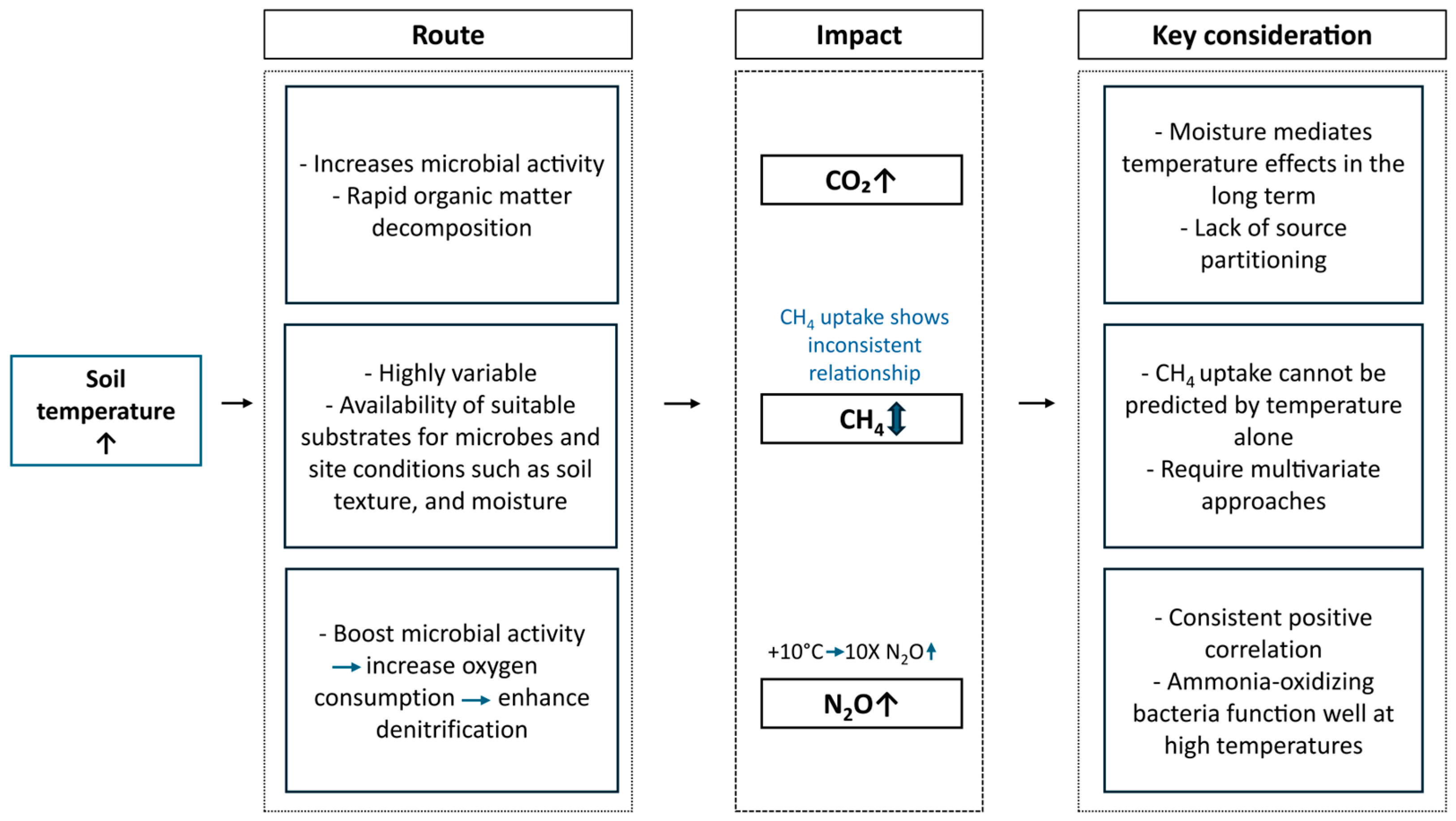 | Factor | Mechanism | Effect on CO2 | Effect on CH4 Uptake | Effect on N2O | References |