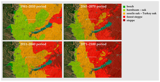 According to the SiteViewer 3.0 [24] decision support system [25], the study area falls into the hornbeam–oak (Querco petreae-Carpinetum) forestry climate zone based on the data from the 1981–2010 period. In the recent past, the site conditions were favourable for Scots pine (Pinus sylvestris) stands (Figure 2). For the period of 2011–2040 the area is predicted to classify as sessile oak-turkey oak forestry climate (Quercetum petreae-cerris), based on the RCP 4.5 climate change scenario. The preferred tree species of this forestry climate category are Scots pine, Turkey oak (Quercus cerris), Grey poplar (Populus × canescens), and Black locust (Robinia pseudoacacia). (Figure 2). Although further drying is predicted in the future—for the period of 2041–2070 and 2071–2100—the area is expected to remain in the same forestry climate class (Figure 2).