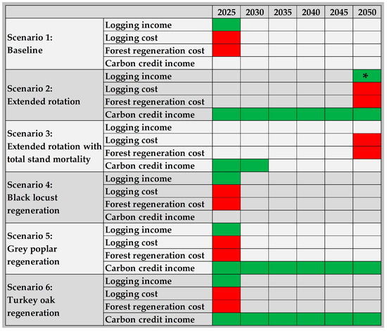 Timeline of cash flows under the different forest management scenarios. Green cells indicate revenues (logging income, carbon credit income), while red cells indicate costs (logging costs, forest regeneration costs). The timeline shows the occurrence of these cash flows under each scenario, highlighting differences in timing. The asterisk (*) in the Extended rotation scenario (2050) indicates that, since the tree stand has reached the stage of over-maturation, both the standing timber volume and its value decline. To represent this in the calculations, only one-third of the harvested timber is assumed to be sold as low-grade roundwood.