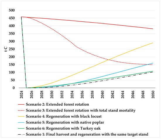 Black locust can be characterized by a substantial carbon sequestration capacity over a short period due to its rapid early growth. By the end of the study period, regeneration with native poplar would also result in higher carbon sequestration compared to the abandoned and dying Scots pine stand (total stand mortality scenario). In contrast, Turkey oak has a low sequestration capacity within the examined period due to its slow growth, and similarly, regeneration with Scots pine (baseline scenario) also results in lower sequestration compared to the other scenarios assessed.