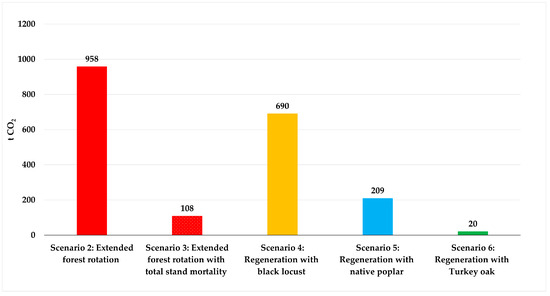 We assessed the mitigation potential of each scenario in comparison to the baseline scenario for the period up to 2050 (Figure 5). The extended rotation cycle showed the highest additional carbon sequestration, with 958 tCO2 above the baseline. In the total stand mortality scenario, we calculated only 108 tCO2 of additional sequestration. Regeneration with black locust resulted in an outstanding 690 tCO2 surplus; however, due to the biodiversity criterion, this amount cannot be accounted for as carbon credits. For native poplar, the additional sequestration of 209 tCO2 is eligible for crediting, although it remains significantly lower than that of black locust. Regeneration with Turkey oak produced the lowest additional sequestration during the study period, with 20 tCO2. Despite their varying magnitudes, these values all represent additional mitigation potential compared to the baseline scenario (regeneration with Scots pine with hornbeam admixture).