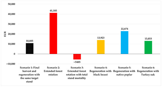 In the Scots pine regeneration baseline scenario, no revenue is generated from carbon credits; therefore, in Figure 6 only the difference between revenues from timber sales and the costs of logging and forest regeneration (net revenue) is shown, expressed as present value. In the extended rotation cycle scenario, in addition to substantial carbon credit revenues, income from timber sales at the end of the examined cycle can also be considered, after deducting regeneration and harvesting costs. This results in the highest total discounted contribution margin of EUR 41,200, assuming a carbon credit price of €50/tCO2.