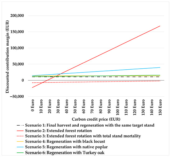 For black locust and Scots pine (baseline) regeneration scenarios, the TDCM is unaffected by the carbon credit price, as neither scenario generates revenue from carbon credits. For black locust, this is due to the biodiversity safeguard of the CRCF, which in this case excludes non-native species from eligibility; therefore, its TDCM is derived solely from timber revenues. For Scots pine, it functions as the baseline reference scenario against which the other management options are compared, and thus does not provide any additional carbon credit revenues. In the total stand mortality scenario, the TDCM remains negative even at the highest carbon credit price. The main characteristics of the presented scenarios and their most important results are summarized in Table 4.
