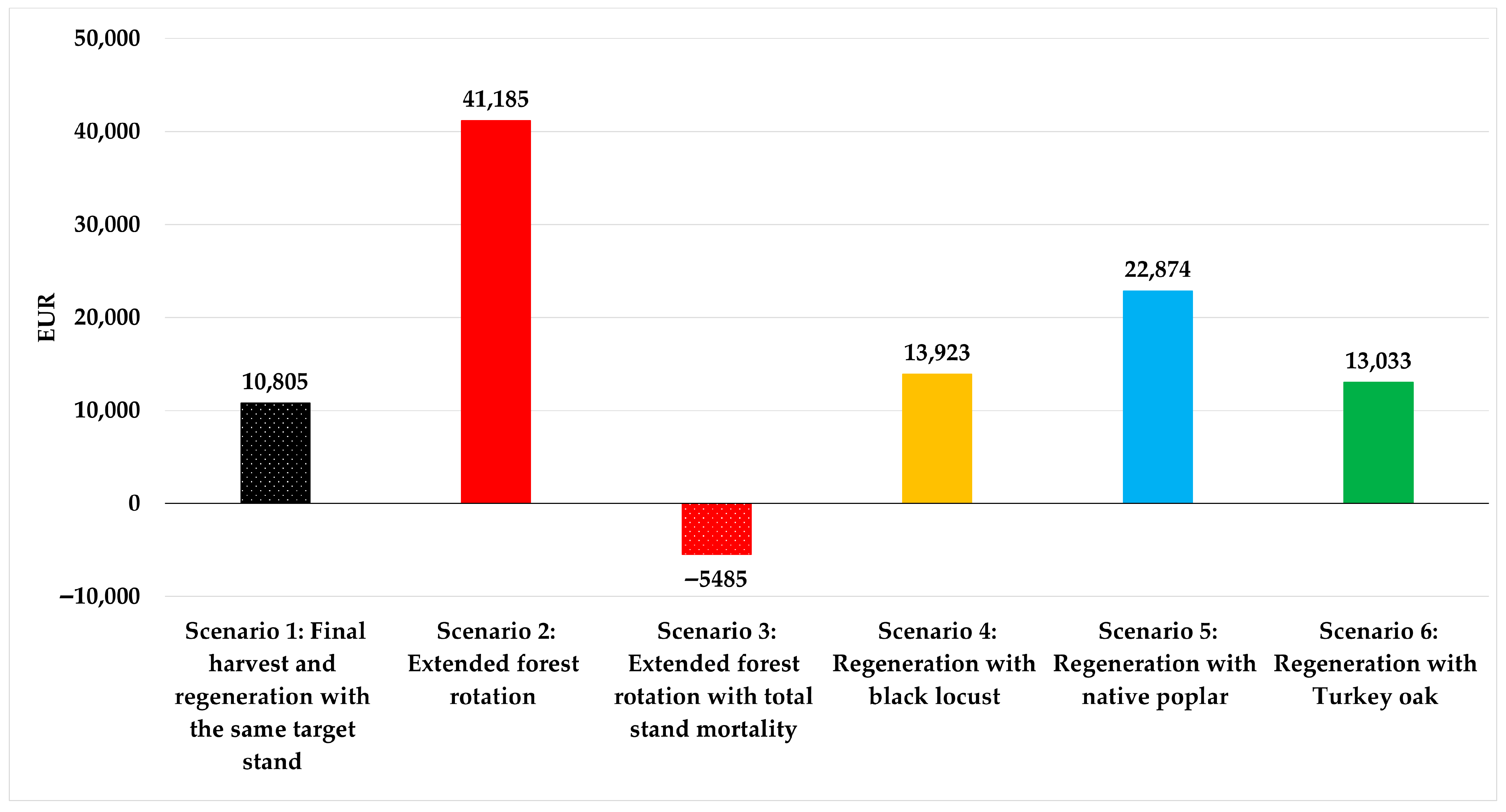 | Scenario Description | Scenario 1: Scots Pine Regeneration (Baseline) | Scenario 2: Extended Forest Rotation | Scenario 3: Extended Forest Rotation with Total Stand Mortality | Scenario 4: Black Locust Regeneration | Scenario 5: Native Poplar Regeneration | Scenario 6: Turkey Oak Regeneration |