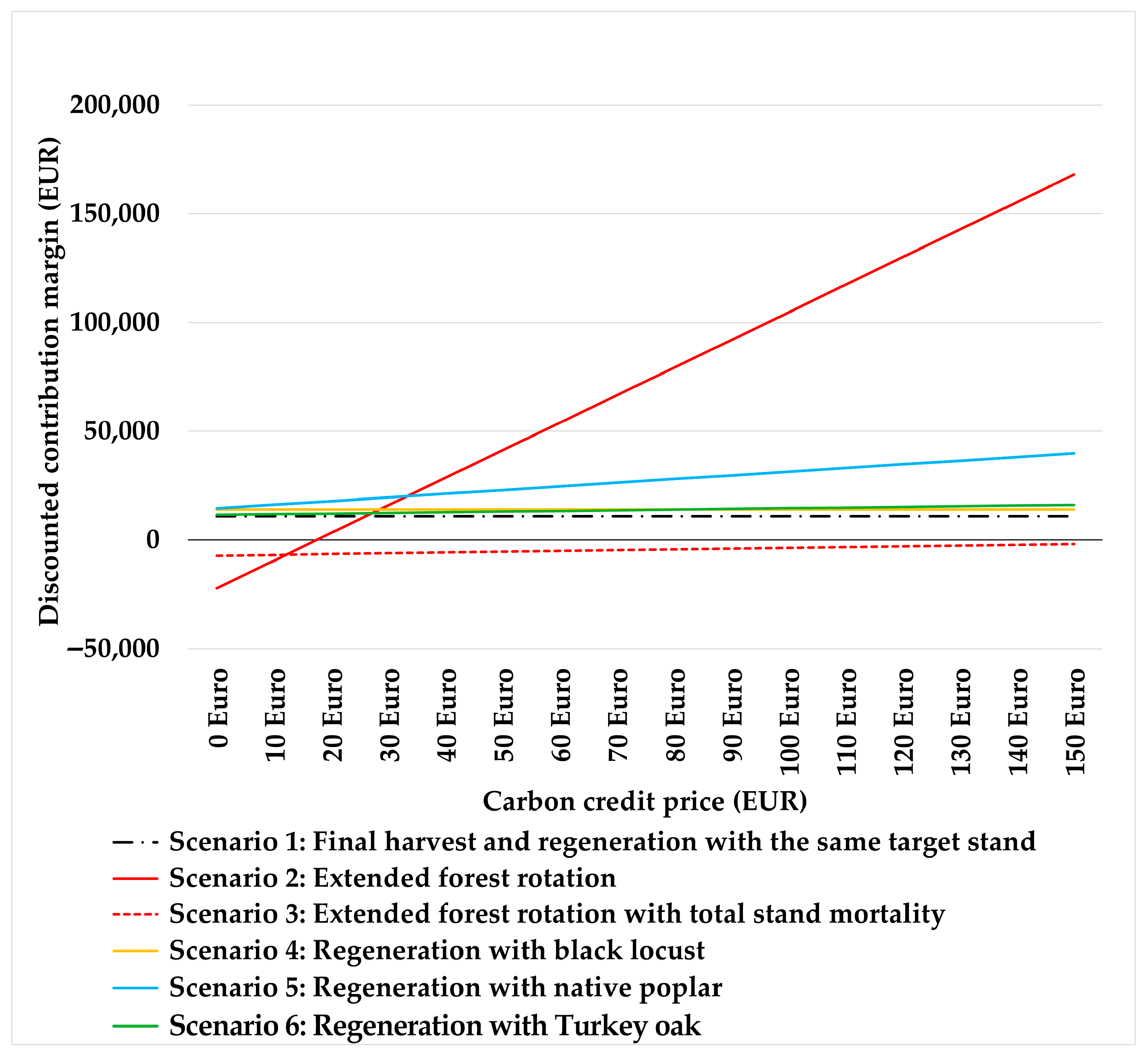 | Discounted carbon credit income at 50 €/tCO2 (EUR/ha) | 0.0 | 13,490.6 | 1894.0 | 0.0 | 1794.5 | 327.2 |