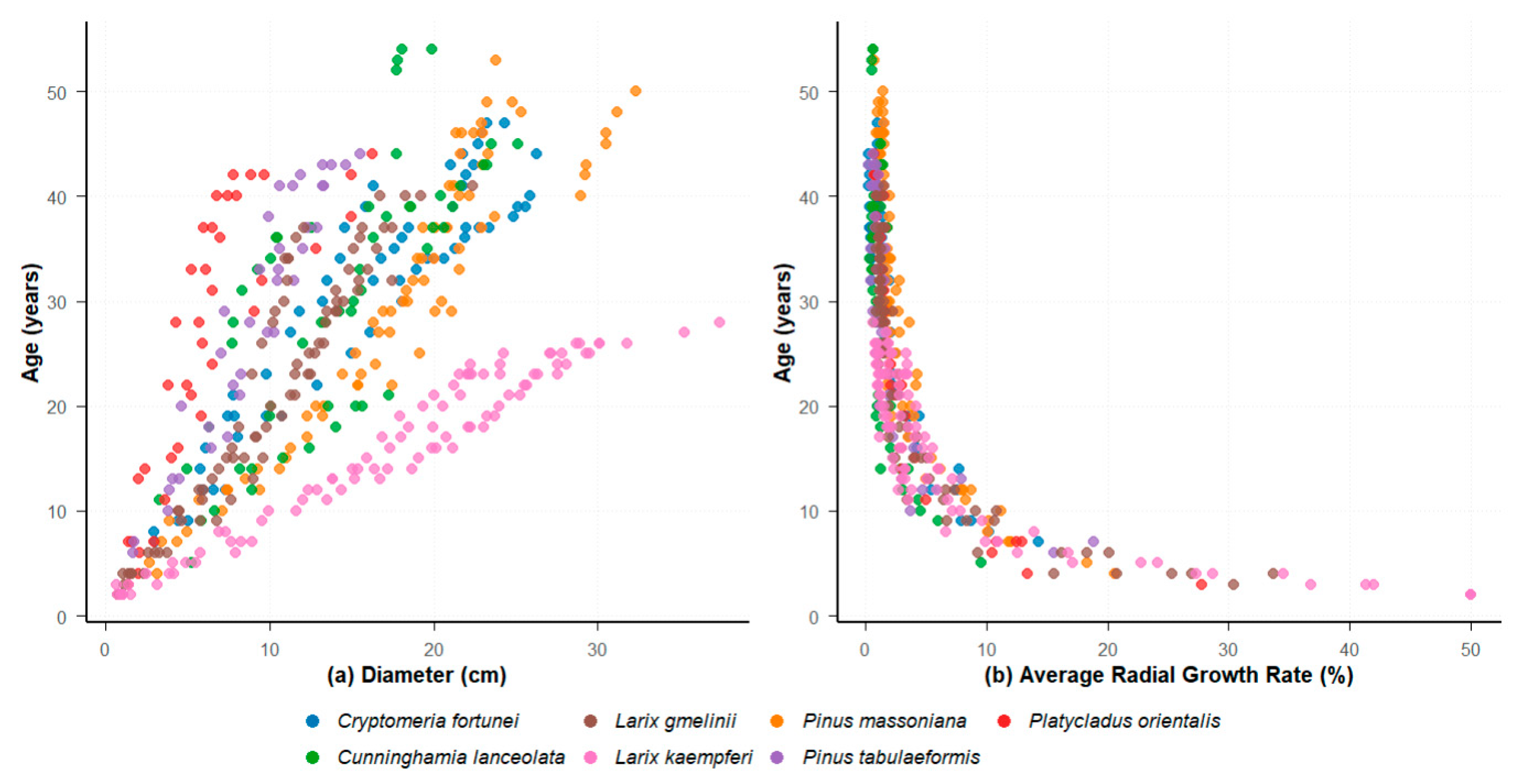 - Zhang, Y.; Li, H.; Zhang, X.; Lei, Y.; Huang, J.; Liu, X. An Approach to Estimate Individual Tree Ages Based on Time Series Diameter Data—A Test Case for Three Subtropical Tree Species in China. Forests 2022, 13, 614. [Google Scholar] [CrossRef]