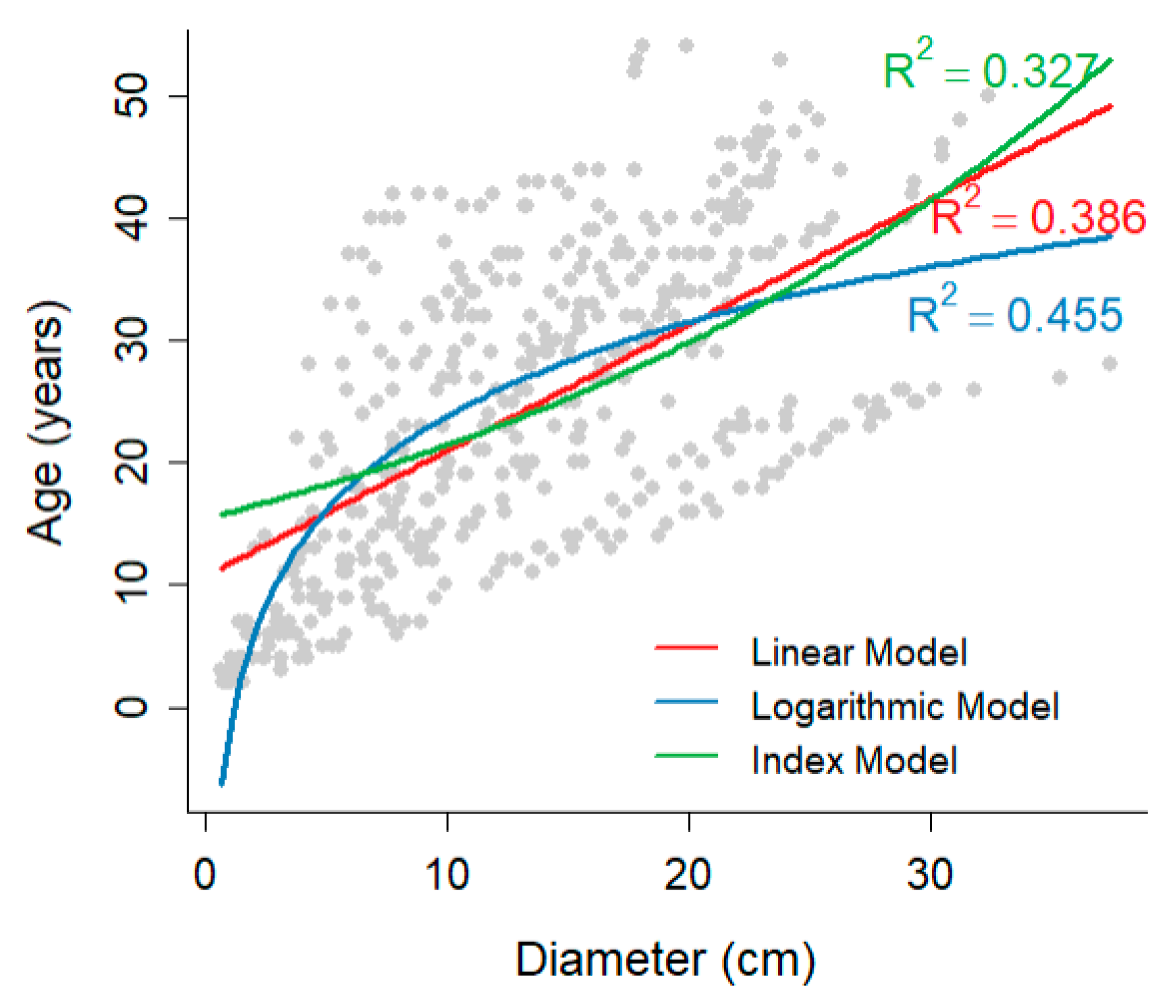 - Rohner, B.; Bugmann, H.; Bigler, C. Estimating the age–diameter relationship of oak species in Switzerland using nonlinear mixed-effects models. Eur. J. For. Res. 2013, 132, 751–764. [Google Scholar] [CrossRef]