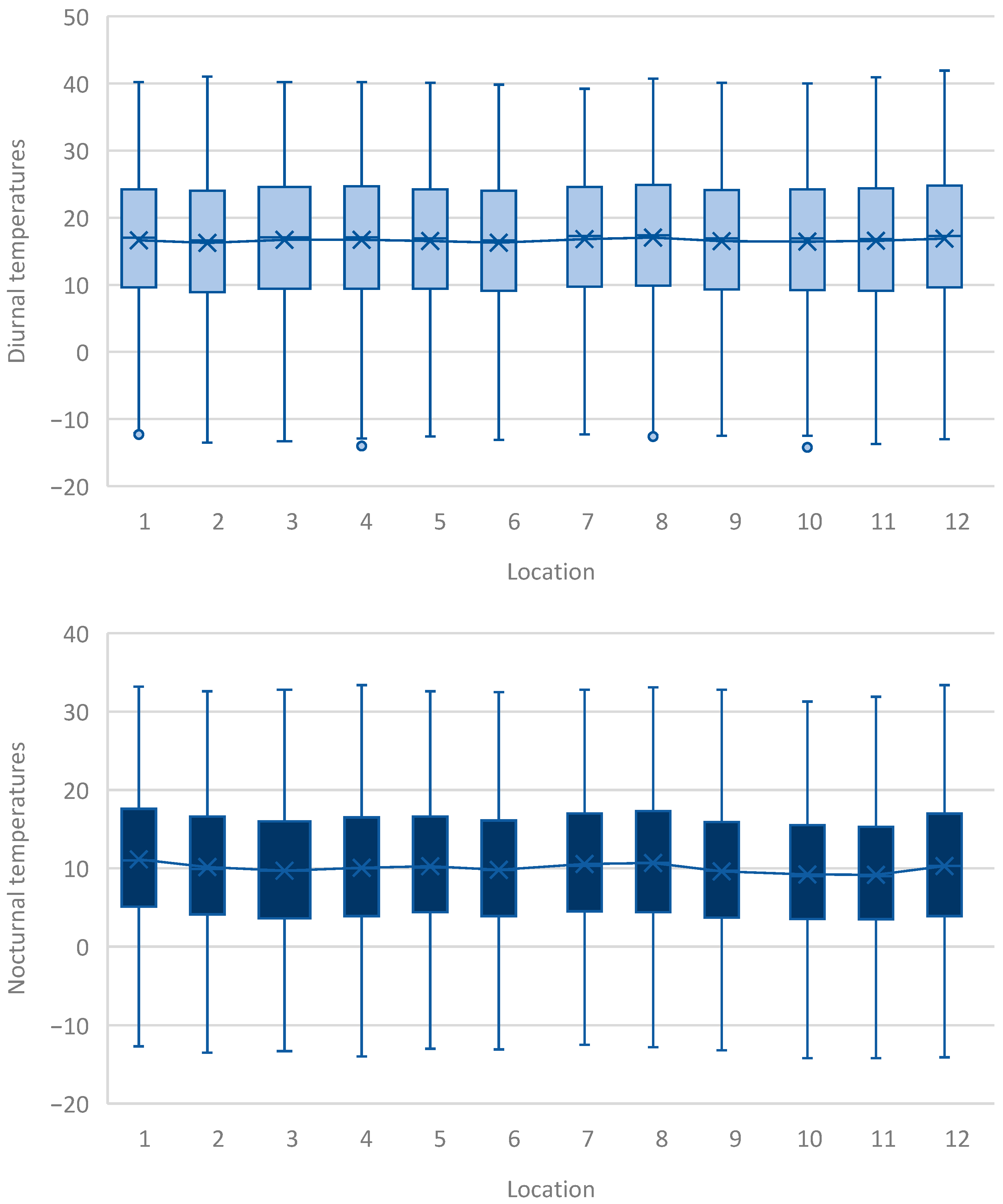 3.2. Diurnal and Nocturnal Variation in Temperature
