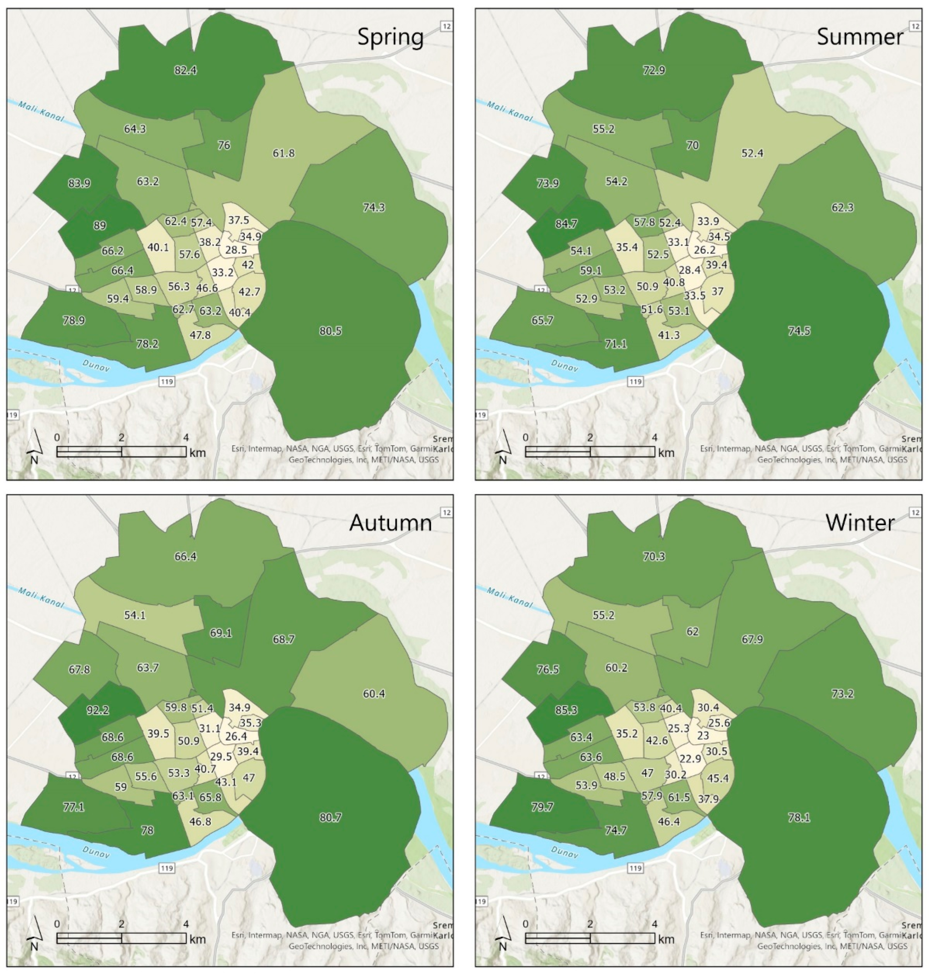 - Simović, I.; Tomićević Dubljević, J.; Tošković, O.; Vujčić Trkulja, M.; Živojinović, I. Underlying Mechanisms of Urban Green Areas’ Influence on Residents’ Health—A Case Study from Belgrade, Serbia. Forests 2023, 14, 765. [Google Scholar] [CrossRef]