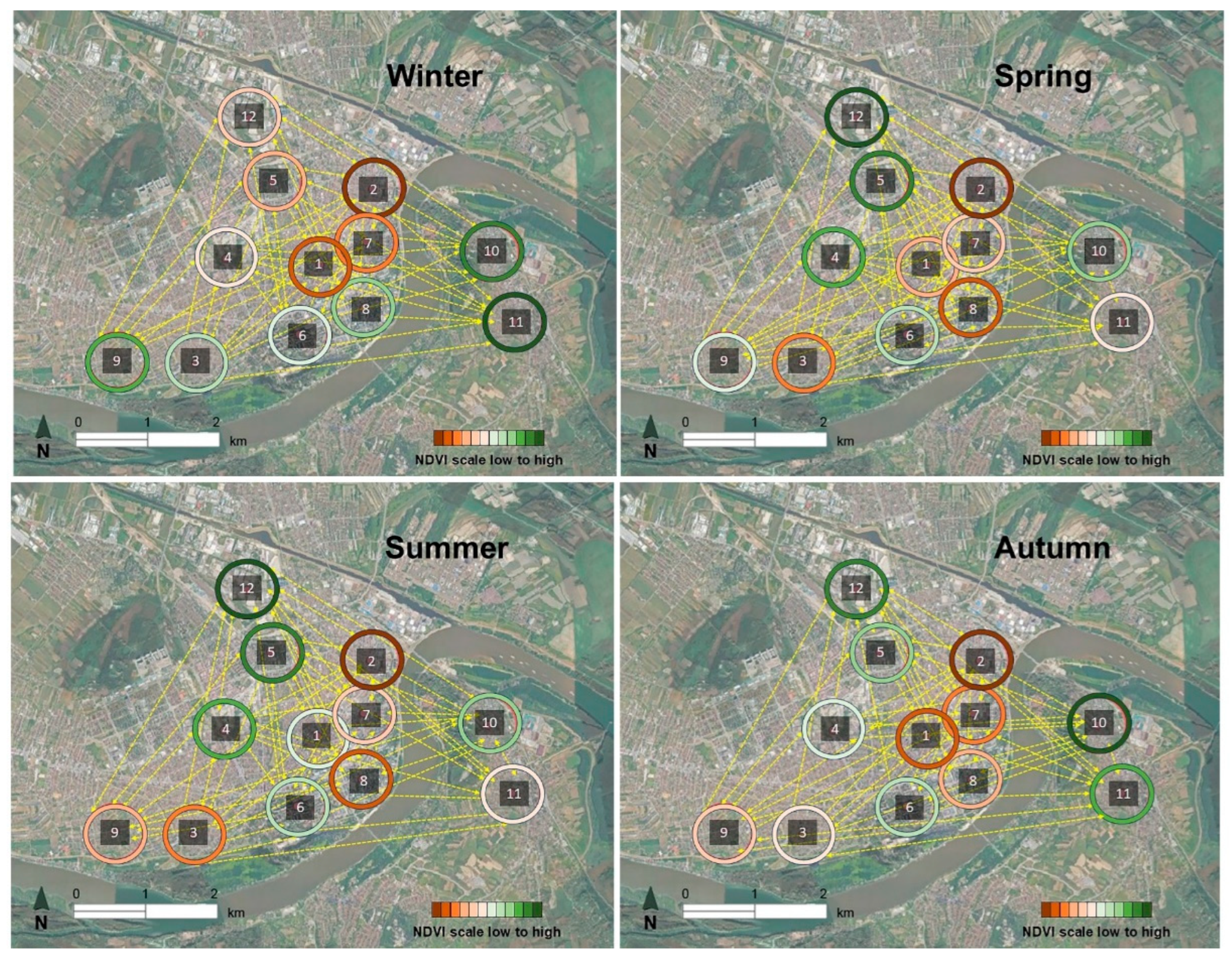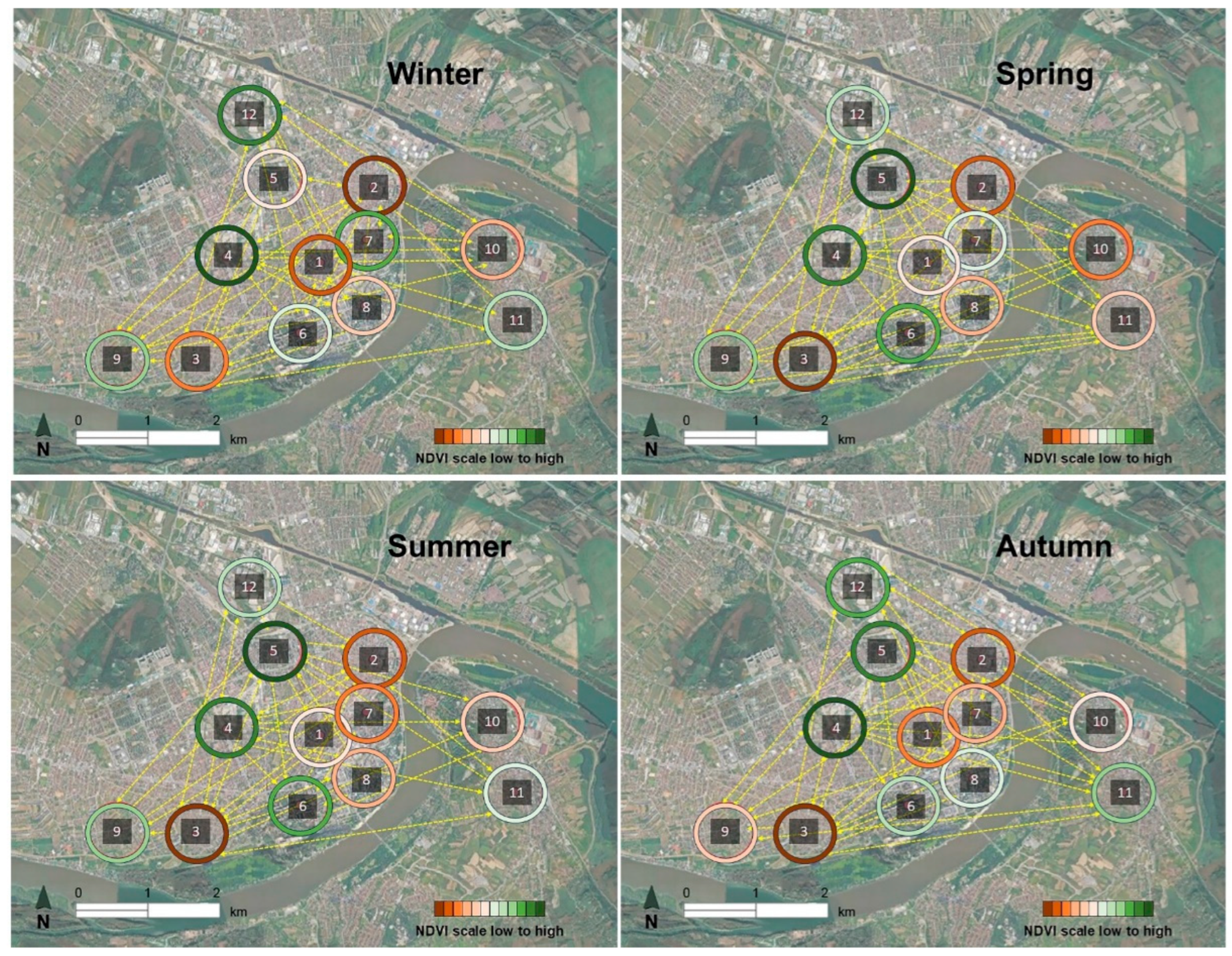| NDVI ≥0.6 buffer 750 m | 0.268 | 0.554 ** | 0.716 ** | 0.736 ** | 0.476 ** | 0.935 ** | 1 | 0.401 ** | 0.831 ** | 0.939 ** | 0.269 | 0.534 ** | 0.637 ** |
