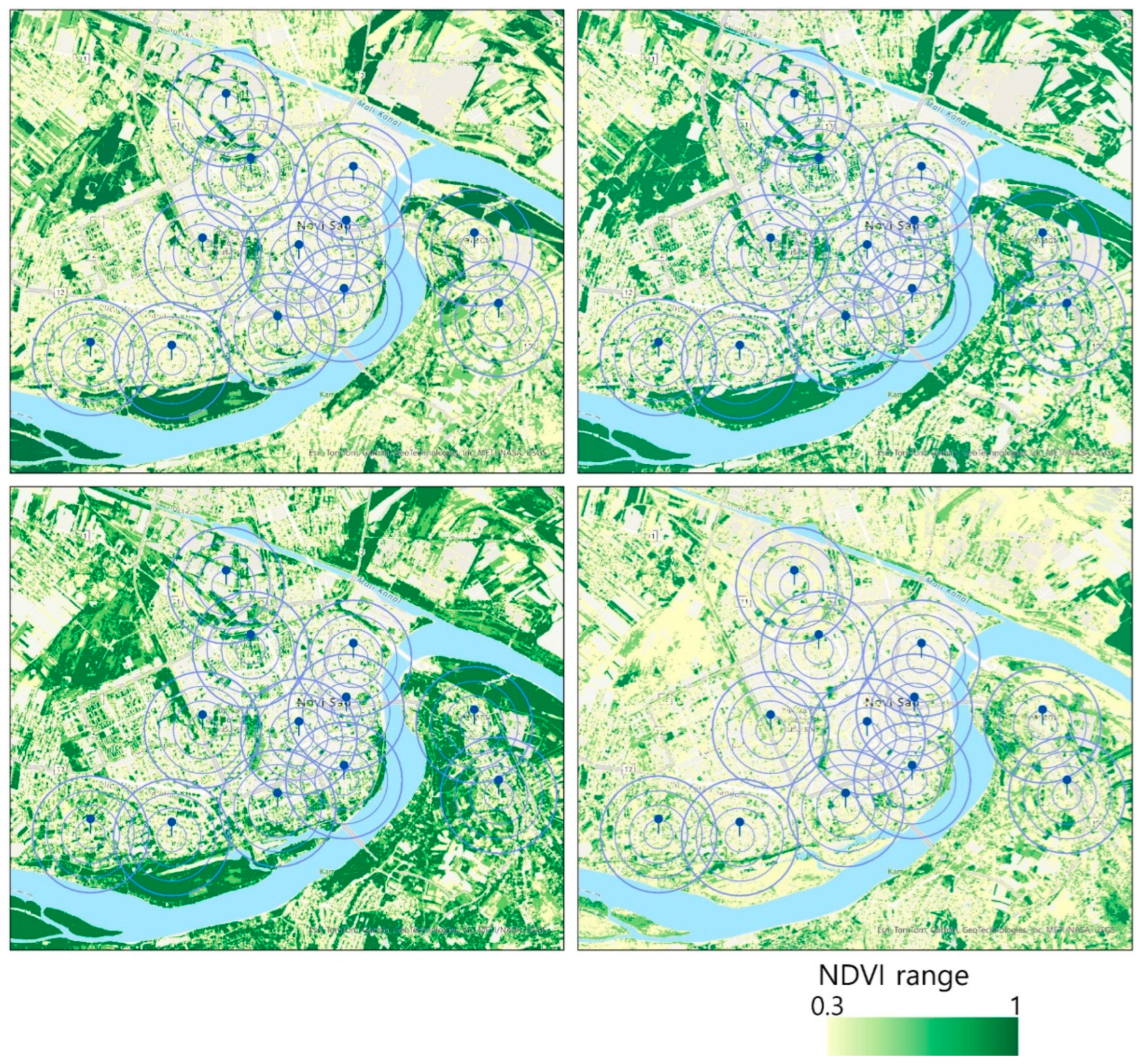 | NDVI ≥0.7 buffer 500 m | 0.435 ** | 0.461 ** | 0.465 ** | 0.421 ** | 0.697 ** | 0.931 ** | 0.831 ** | 0.723 ** | 1 | 0.917 ** | 0.656 ** | 0.876 ** | 0.818 ** |