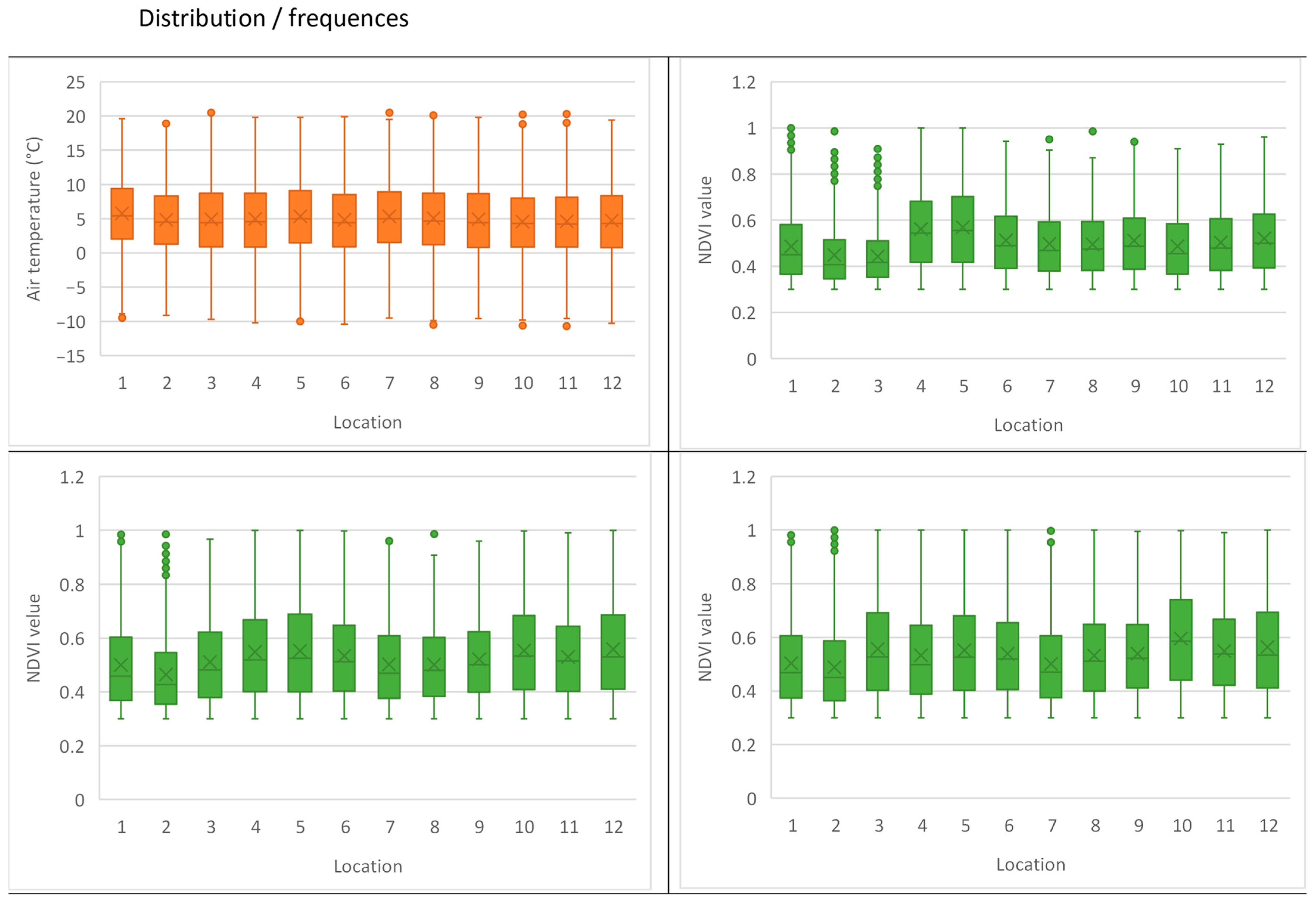 | Temperature | Greenery Size Buffer 250 m | Greenery Size Buffer 500 m | Greenery Size Buffer 750 m | NDVI ≥ 0.6 Buffer 250 m | NDVI ≥ 0.6 Buffer 500 m | NDVI ≥ 0.6 Buffer 750 m | NDVI ≥ 0.7 Buffer 250 m | NDVI ≥ 0.7 Buffer 500 m | NDVI ≥ 0.7 Buffer 750 m | NDVI ≥ 0.8 Buffer 250 m | NDVI ≥ 0.8 Buffer 500 m | NDVI ≥ 0.8 Buffer 750 m | |