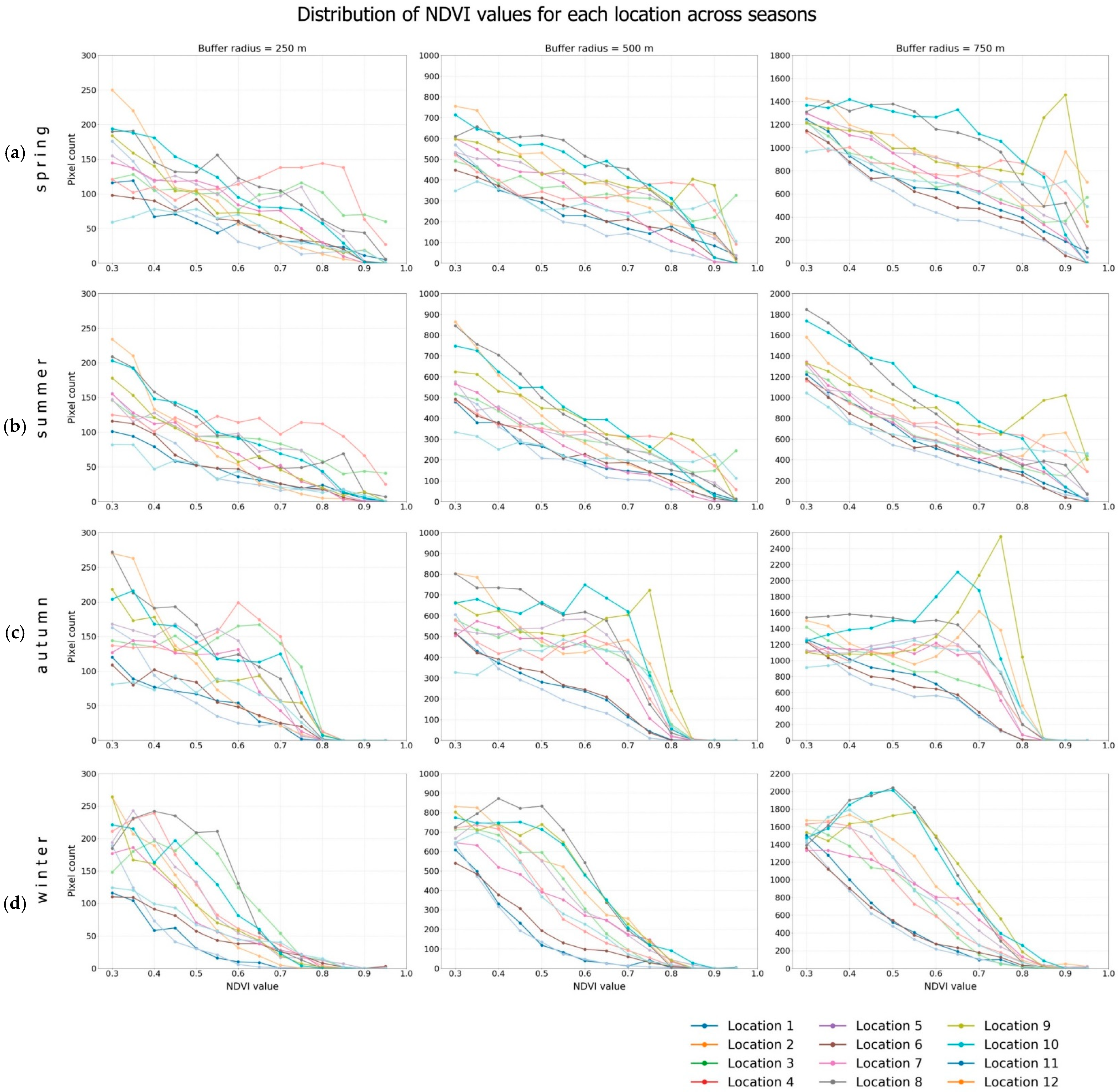 | NDVI ≥0.8 buffer 750 m | 0.467 ** | 0.186 | 0.273 | 0.269 | 0.402 ** | 0.652 ** | 0.637 ** | 0.491 ** | 0.818 ** | 0.832 ** | 0.524 ** | 0.901 ** | 1 |