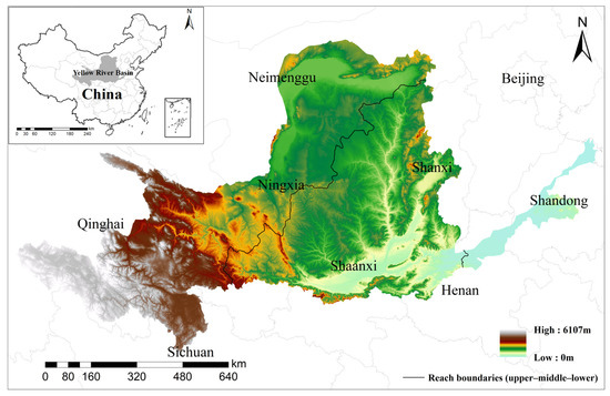 The YRB is divided into three sections: (i) the upper reaches—from the headwaters to Hekou Town, including Qinghai, Sichuan (Zoige/Tangke), Gansu, Ningxia, and western Inner Mongolia; (ii) the middle reaches—from Hekou Town to Taohuayu (Zhengzhou, Henan), covering southern Inner Mongolia, northern Shaanxi, western Shanxi, and western Henan; and (iii) the lower reaches—from Taohuayu to the Bohai Sea, mainly spanning eastern Henan and Shandong. The main stem is 5464 km long and drains 752,400 km2. The basin has a pronounced west–east stepwise topography, with three terraces and strong climatic gradients (Figure 1). The first terrace on the Qinghai–Tibet Plateau generally lies above 3000 m and is characterized by low temperatures, limited precipitation, and arid conditions. The second terrace is the Loess Plateau (1000–2000 m), which has a relatively gentle relief and marked ecological fragility. Intense summer rainfall drives severe soil erosion and delivers large sediment loads to the Yellow River, making the YRB a priority area for afforestation and ecological restoration. The third terrace corresponds to the North China Plain, which lies mostly below 100 m and has a mean annual temperature of approximately 13–15 °C under a monsoonal climate, with hot summers and cold winters [25].
