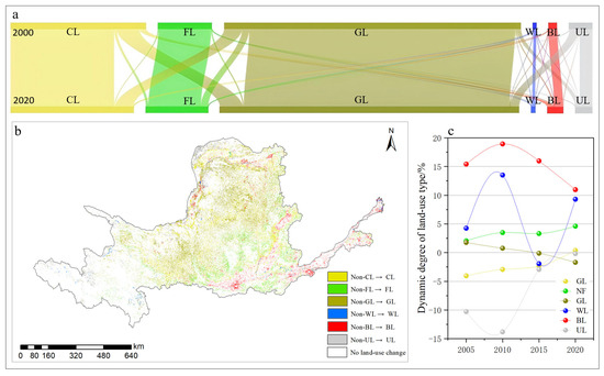 Land-use conversions in the YRB, 2000–2020: (a) Sankey diagram of land-use conversions between 2000 and 2020; (b) Spatial distribution of land-use changes between 2000 and 2020; (c) Dynamic degree of land-use type. Abbreviations: CL, cropland; FL, forest land; GL, grassland; WL, water; BL, built-up land; UL, unused land.