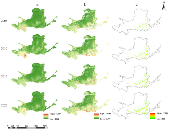 Spatiotemporal patterns of carbon storage in the YRB, 2000–2020: (a) total ecosystem carbon (TEC); (b) aboveground carbon (AGC); and (c) planted forests aboveground carbon (PF-AGC).