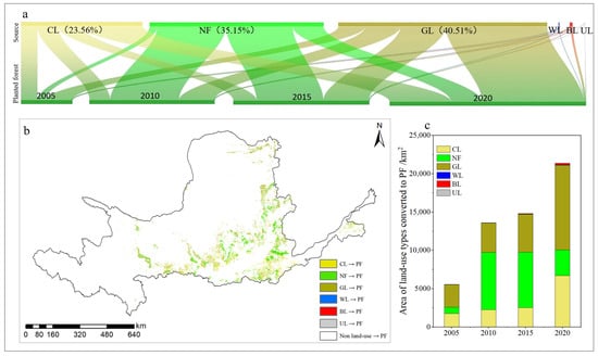 Land-use classes converted to planted forests (PFs) in the YRB from 2005 to 2020. (a) Flow pattern of conversion of major land-use types into PF across sub-periods: (b) Spatial distribution of land-use types converted to PFs from 2005 to 2020; (c) Area of land-use types converted to PFs in different periods. Abbreviations: NF, natural forest; PF, planted forest.