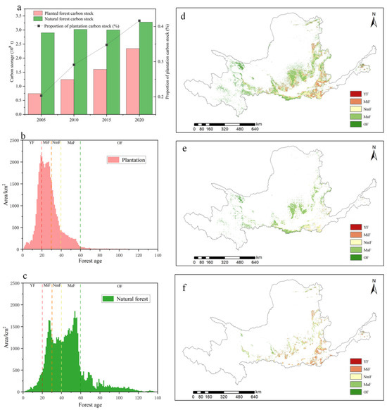 Age structure of planted forests (PFs) and natural forests (NFs) in the YRB, 2005–2020: (a) carbon storage of PFs and NFs and their shares; (b) PF age-class composition and area by age class; (c) NF age-class composition and area by age class; (d) spatial distribution of stand age, 2020 (all forests); (e) spatial distribution of NF stand age, 2020; (f) spatial distribution of PF stand age, 2020. Abbreviations: YF, young (≤10 yr); MiF, middle-aged (11–25 yr); NmF, near-mature (26–40 yr); MaF, mature (41–70 yr); OF, overmature (≥71 yr).